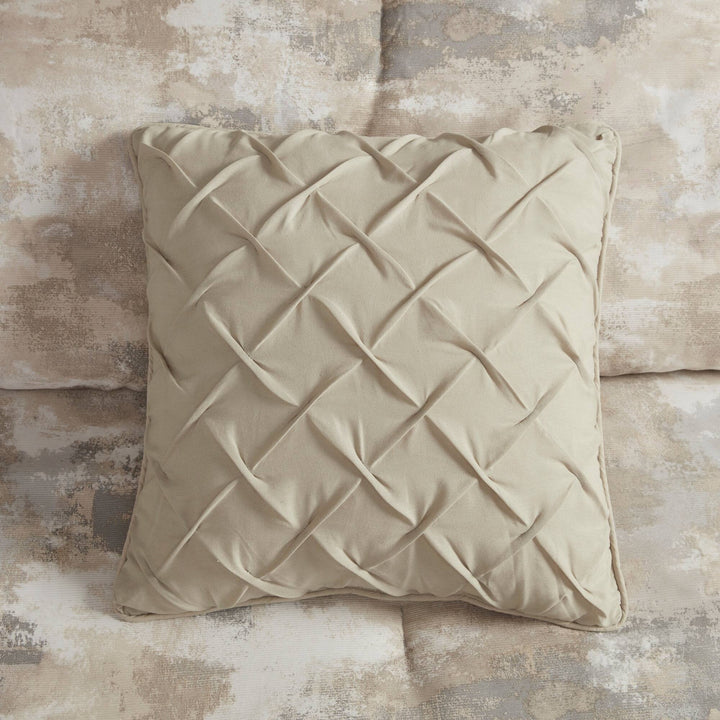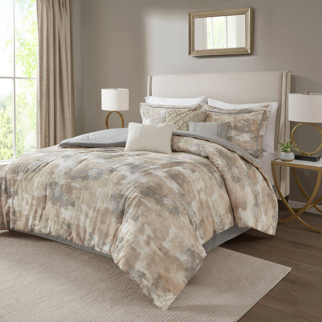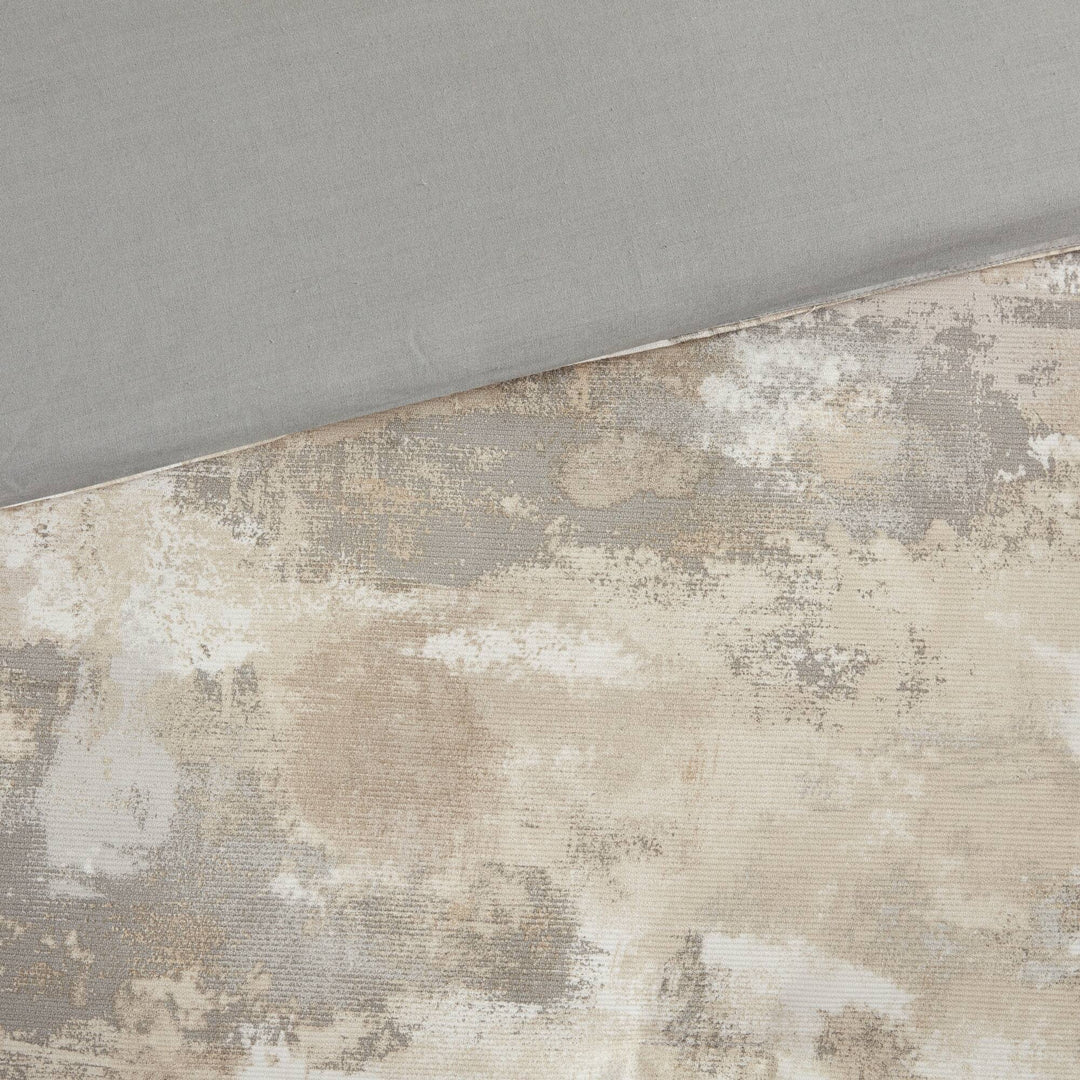 Modernize your bedroom decor with the chic styling of the Madison Park Beacon 7 Piece Comforter Set. This luxurious comforter features an abstract print on the cotton-rich ottoman face with a solid grey reverse to create a glamorous look. The 2 matching shams mirror the abstract design of the comforter, while 3 coordinating decorative pillows with embroidered details add the finishing touches. A complementary solid grey bed skirt provides a clean finish to complete this modern comforter set. This bedding set is also OEKO-TEX certified, meaning it does not contain any harmful substances or chemicals to ensure quality comfort and wellness.