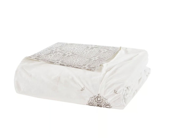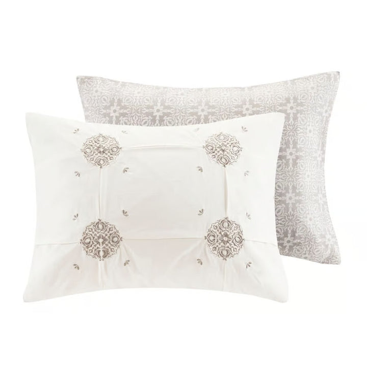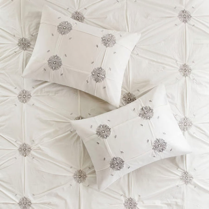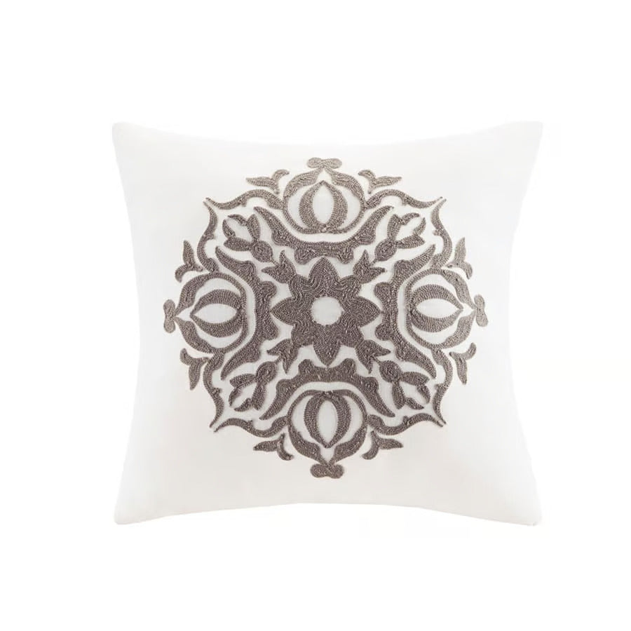 Style your bedroom with the shabby chic allure of the Madison Park Malia 4 Piece Embroidered Cotton Reversible Duvet Cover Set. The face of the reversible duvet cover features tufted grey embroidery on an ivory base, while the reverse showcases an all-over grey medallion print that complements the top of the bed. Two matching shams mirror the face of the cotton duvet cover and an embroidered medallion design on the square decorative pillow provides an elegant finishing touch to the cotton duvet cover set. Machine washable for easy care, this reversible duvet cover set is made from 100% cotton and provides a comfortable shabby chic update to your bedroom décor. Button closures help secure a comforter insert within the duvet cover and four inside ties in the corners help prevent it from shifting (insert is NOT included). Items in the set may come in a rolled or compressed packaging, which will need to be fluffed up or steam ironed before use to remove wrinkles.