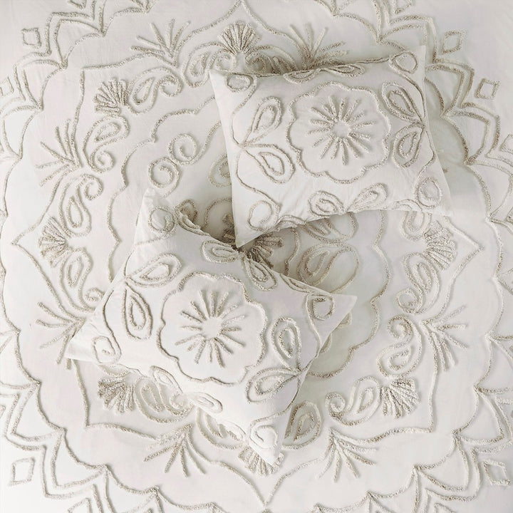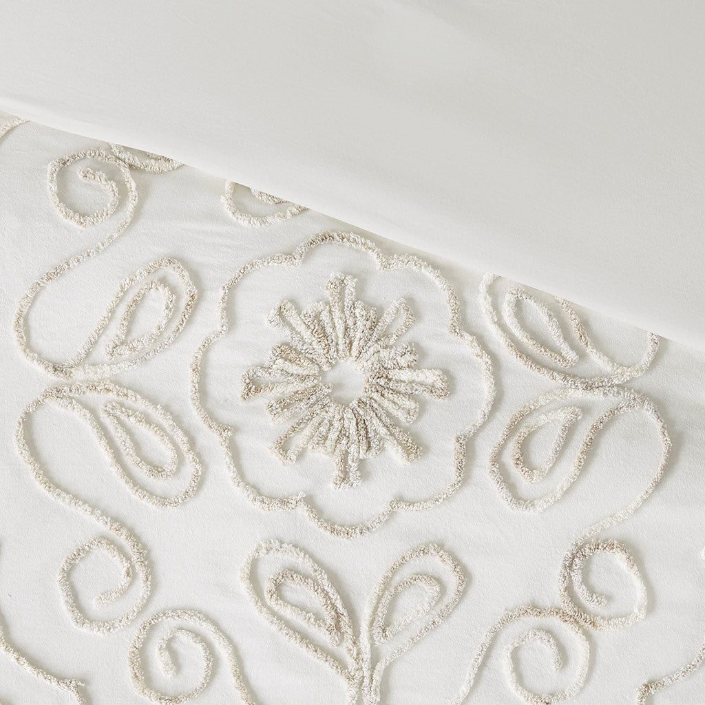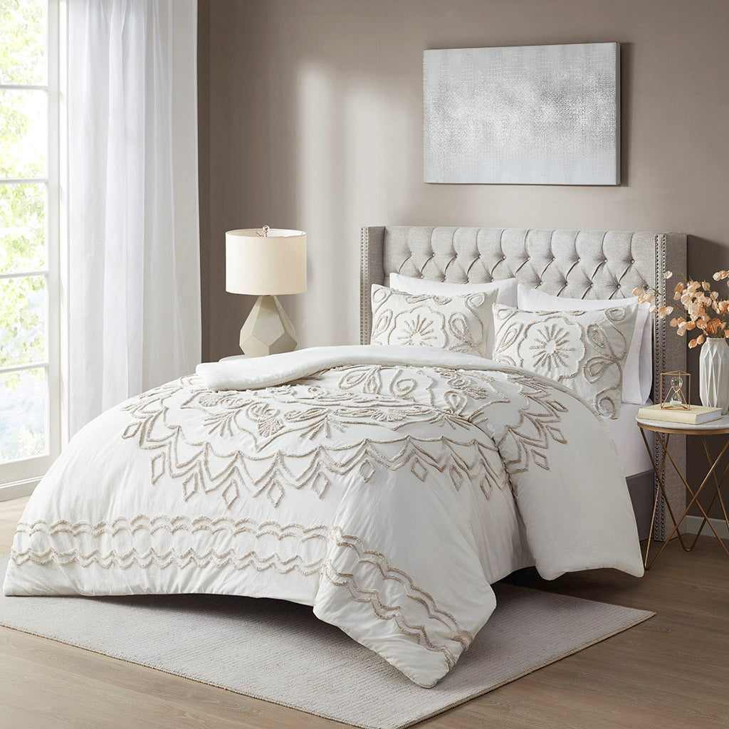 The Madison Park Violette 3 Piece Tufted Cotton Duvet Cover Set offers an elegant and charming update to brighten your bedroom décor. An ivory and taupe medallion design, made with tufted chenille, creates a textural globally inspired look. Matching shams mirror the beautiful design on the duvet cover to complete the cotton bedding set. Made from 100% cotton chenille on the face and reverse, this duvet cover set offers a gorgeous combination of style and comfort to elevate your bedroom decor. A button closure helps secure a comforter insert within the duvet cover and inside ties in the corners help prevent it from shifting (insert is NOT included). Due to the nature of the chenille fabric, some shedding will occur naturally in the first 3-4 washes.