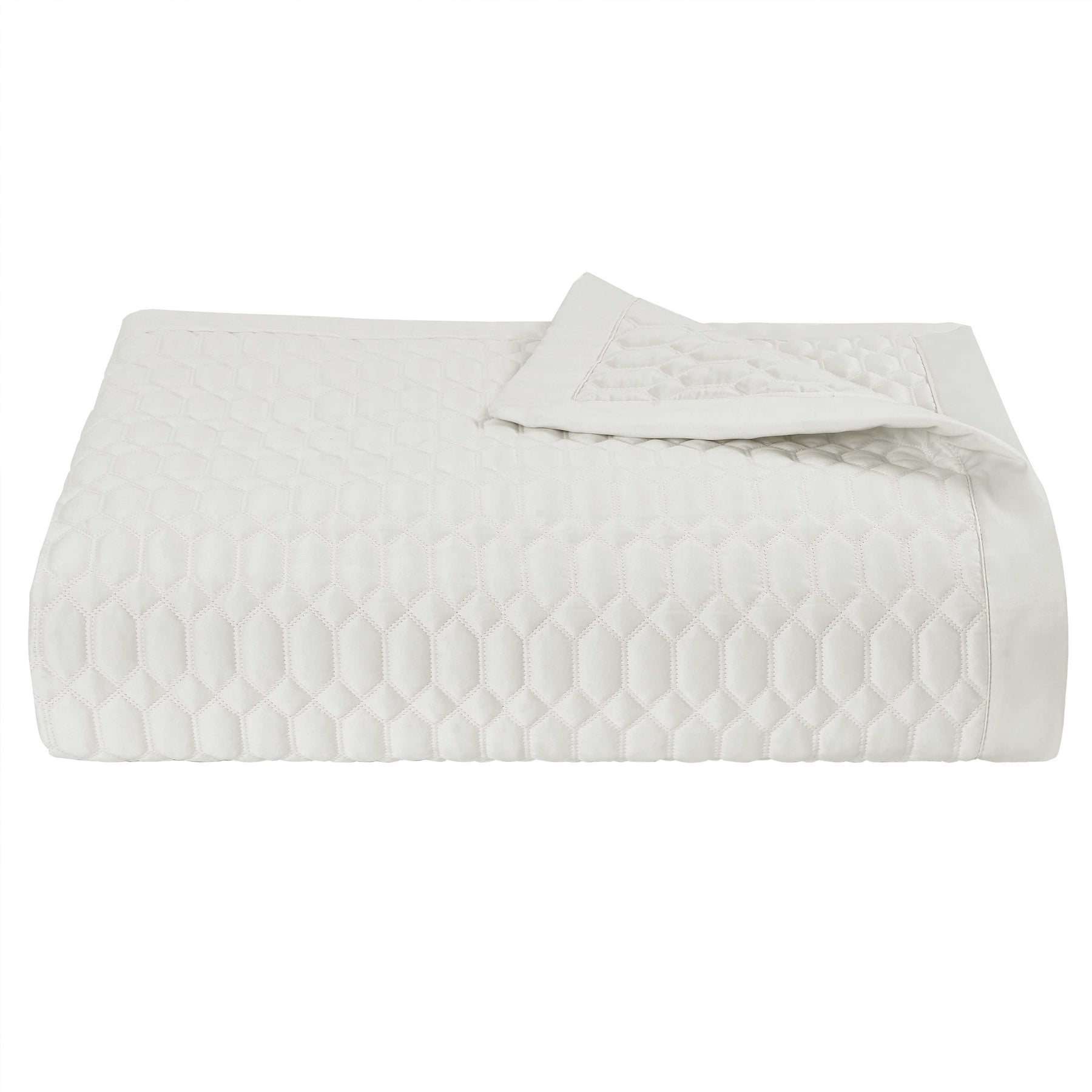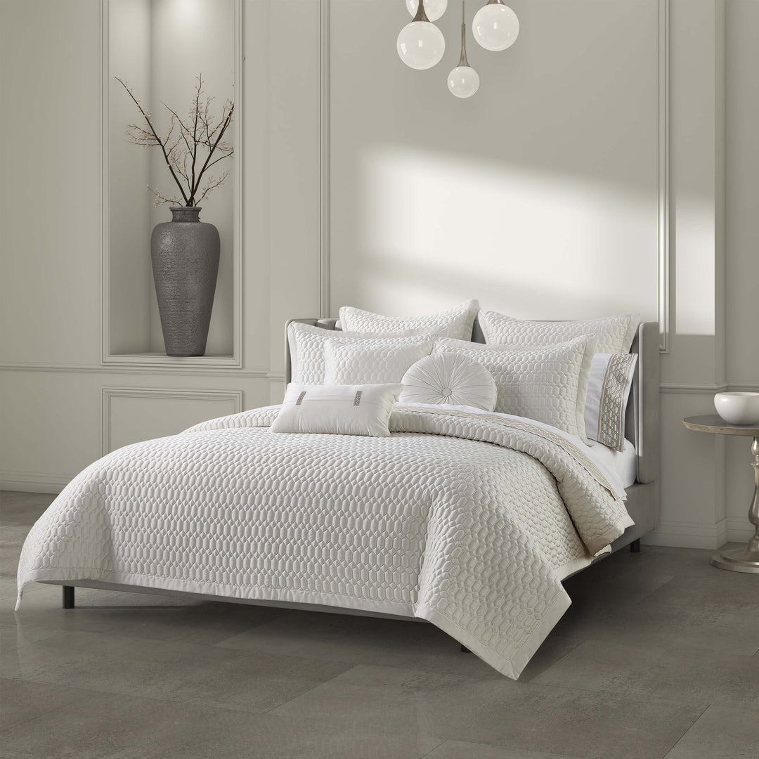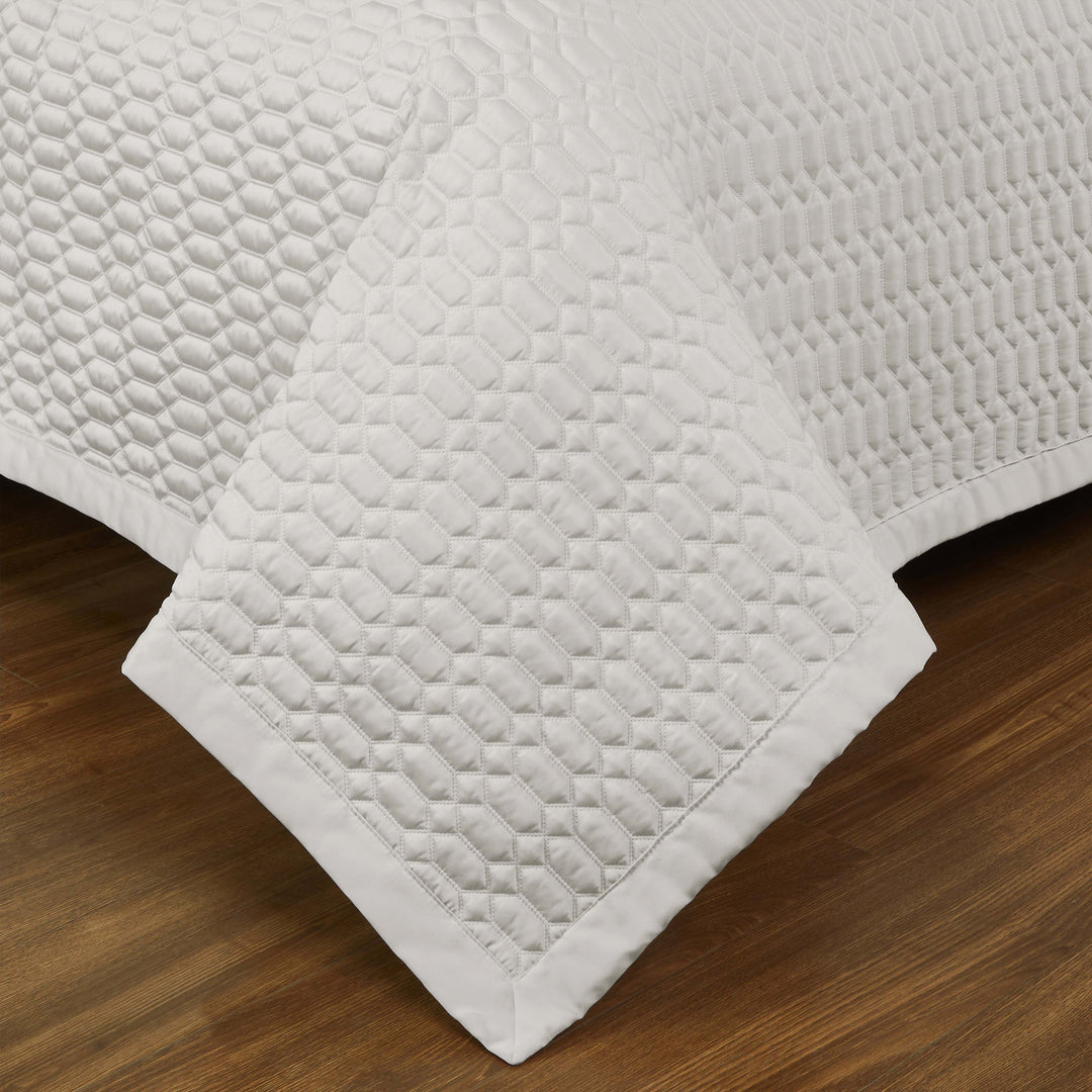 Add sleek modern luxury to your bedroom with the glamorous brilliance quilt set. This fabric is a highly constructed plush satin, designed to add a layer of elegance to your bedding. Featuring a custom geometric quilted pattern, bordered by a 2" mitered trim and pairs beautifully with an existing bed set or fairs well on its own. Add the coordinate throw pillows and euro shams to complete the look (sold separately). Available in your choice of neutral color options.