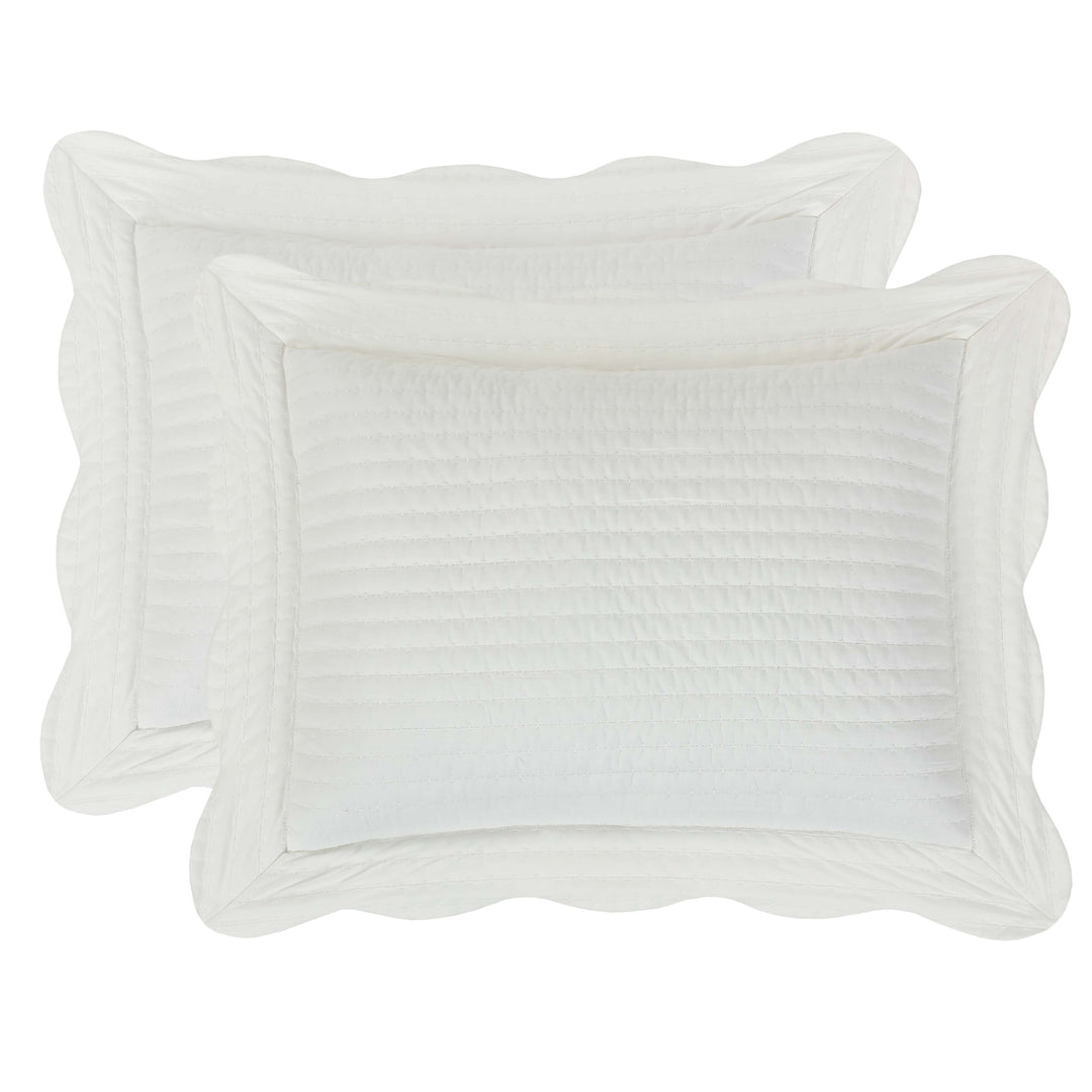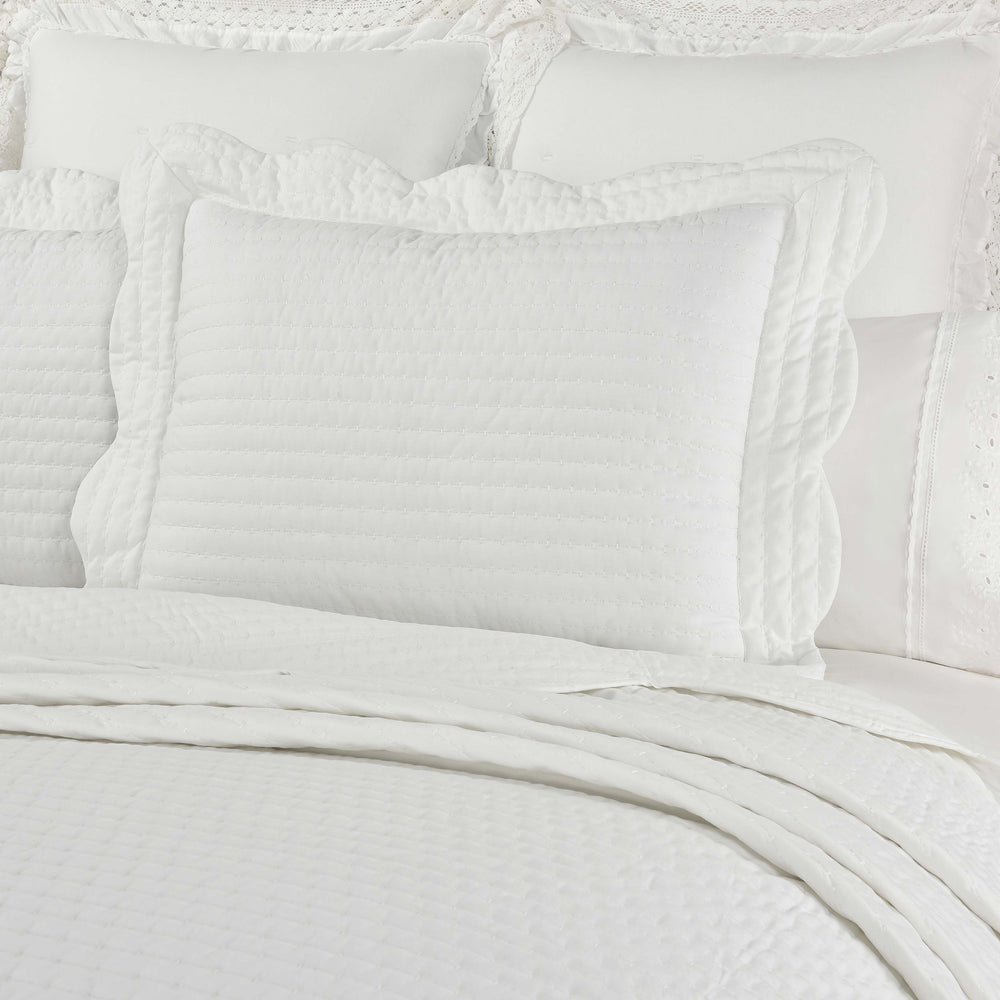 Frame your bed with the relaxed scalloped border of the amherst quilt. Featuring a timeless farmhouse style white cotton center, with a 5‚¬� scallop trim on all four sides, with rounded corners for a beautiful drape look. Soft pre-washed cotton on both sides gives this lightweight layer an irresistibly smooth hand feel. Available in multiple color options to match your decor, a colored thread is used for the intricate channel quilt stitching, and the reverse fabric matches the border for a touch of color. Pair this quilt with the amherst quilt pillow shams, and it is easy to mix-and-match with euro shams and throw pillows from the piper & wright collections to create your own unique look.