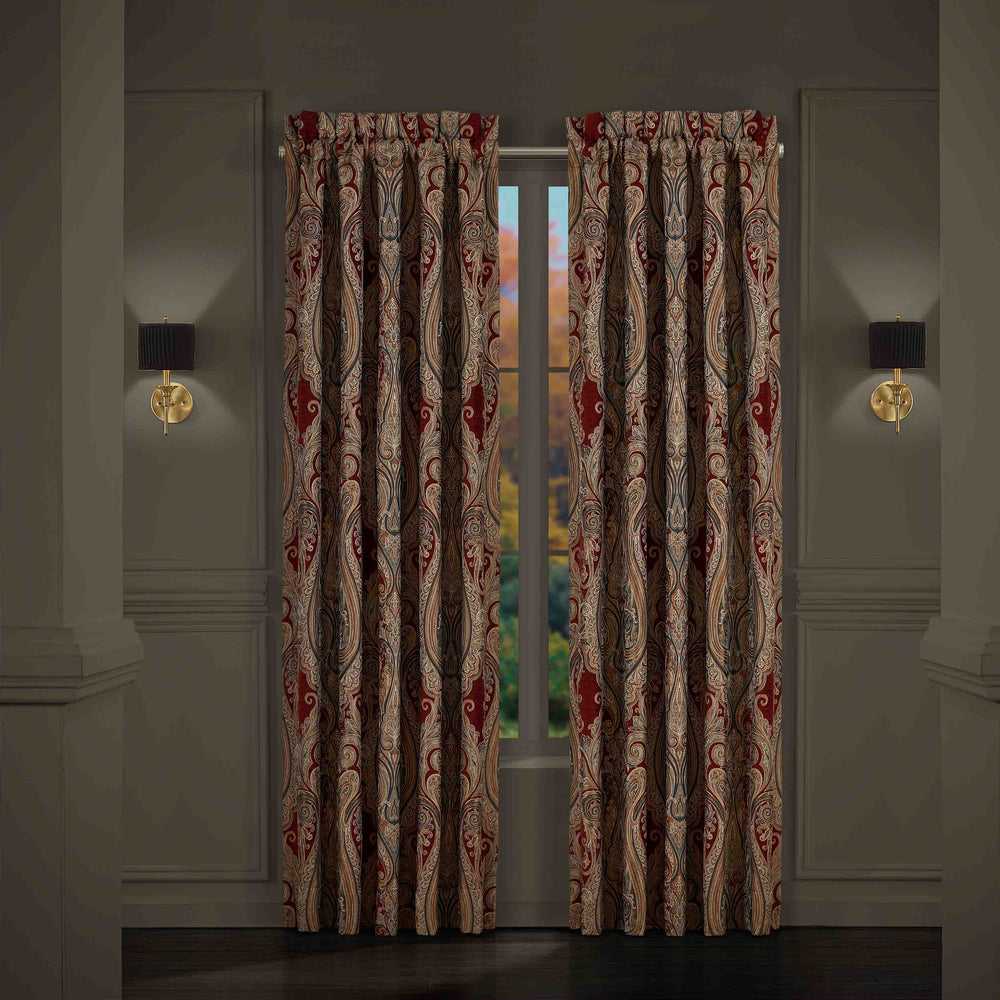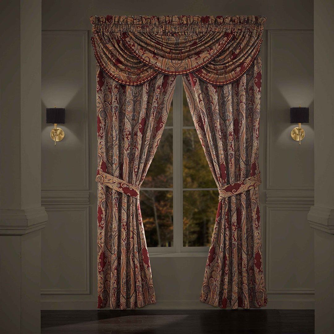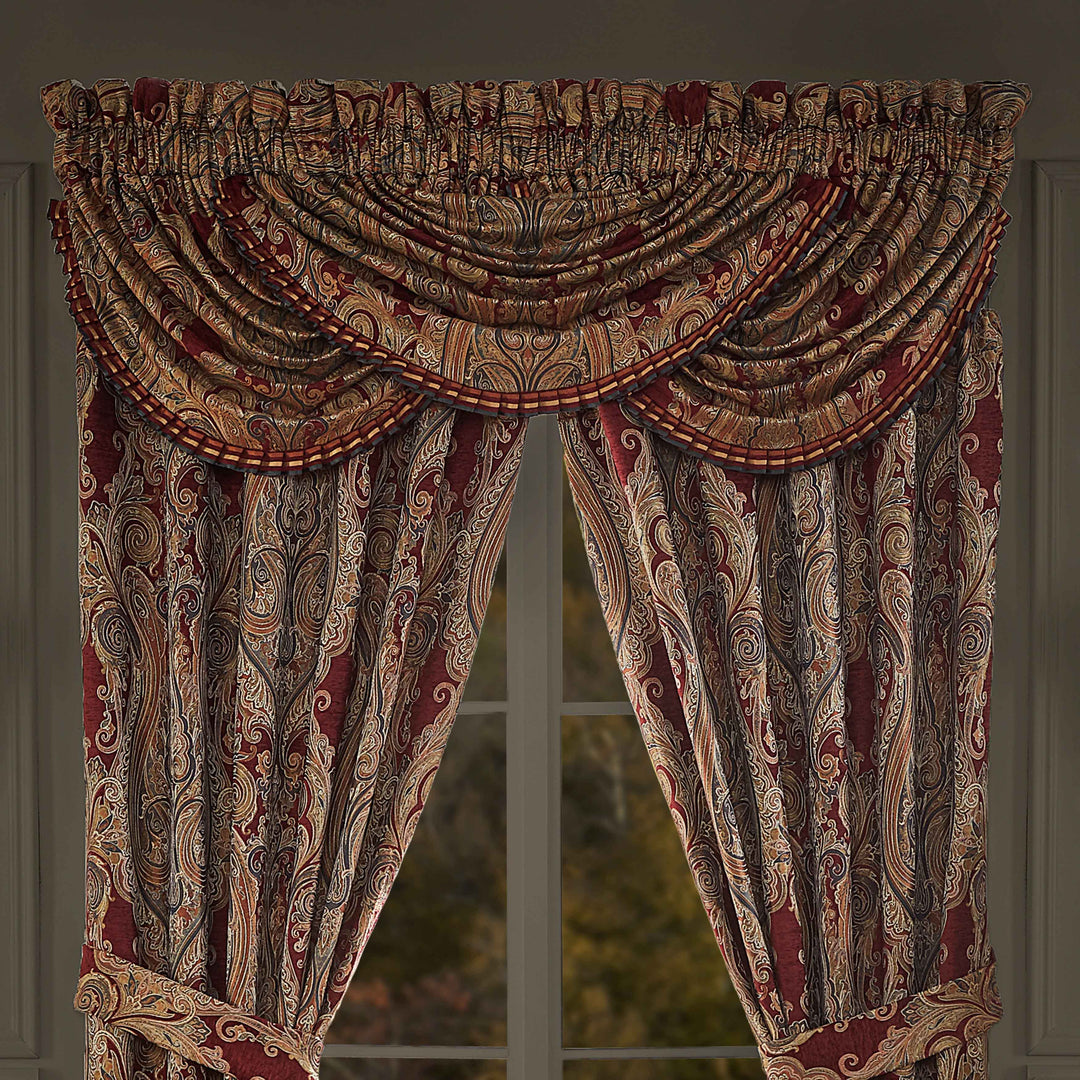 The garnet 4 piece comforter set collection is majestic with its graceful design and beautiful woven jacquard lines in shades of red, teal, brown, caramel and cream. Using chenille and twisted yarns this woven ensemble is truly luxurious and grand. Paired with matching hidden zipper closure shams and a solid red chenille split-corner bedskirt, this design is sheer perfection. This oversized ensemble features a plush solid reverse microfiber dyed to match the red ground from the face and is finished with a 1/4" red chenille piping. Pair this collection with the garnet throw pillows and window treatments by J. Queen new york to complete the look.