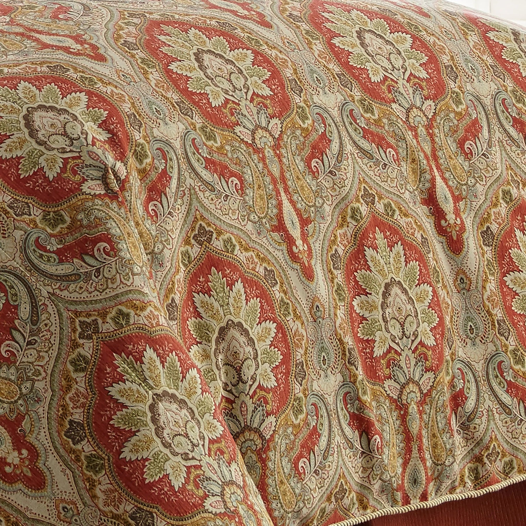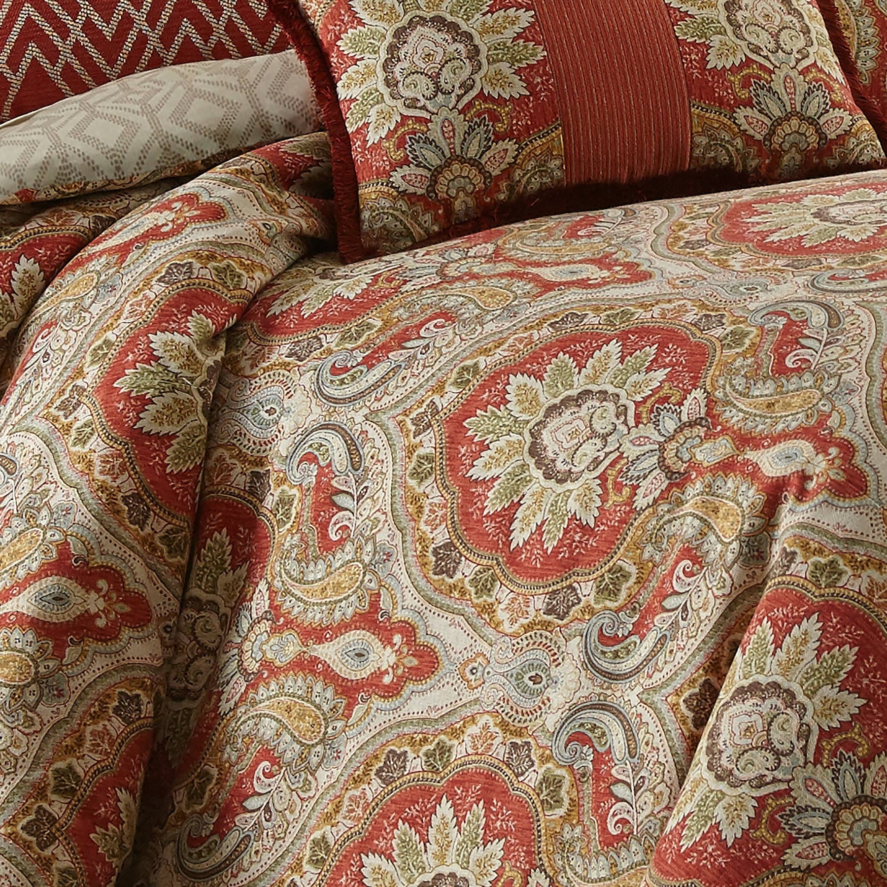 Rose Tree is characterized by ardent attention to detail. Superior workmanship with an air of elegance and refinement. Harrogate collection by Rose Tree. Modern elegance coupled with updated classical styling defines the Rose Tree collection. Traditional and timeless design. Classic red colorway is the dominant color in this multi colored paisley print. Comforter set includes four pieces in total. Oversized comforter designed to fit pillow top mattresses. Lofty, premium 8 ounce poly fill. Fully reversible comforter with two shams. Bedskirt is generously sized with an 18" drop, tailored with a 4" center pleat.