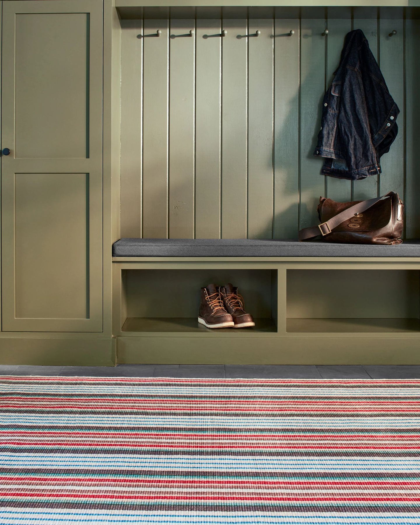 Part of our best-in-class collection of design-focused, machine-washable rugs. Even cowgirls get the blues (and red and browns and whites). With its bold repeating stripes and versatile colors, this superior quality, machine washable rug is at home on the range, or in any room you want to place it. Ideally suited for high-traffic areas like playrooms, kitchens, and entryways, it lies flat and remains soft underfoot with no shedding or fuzzing, even after multiple washes.
