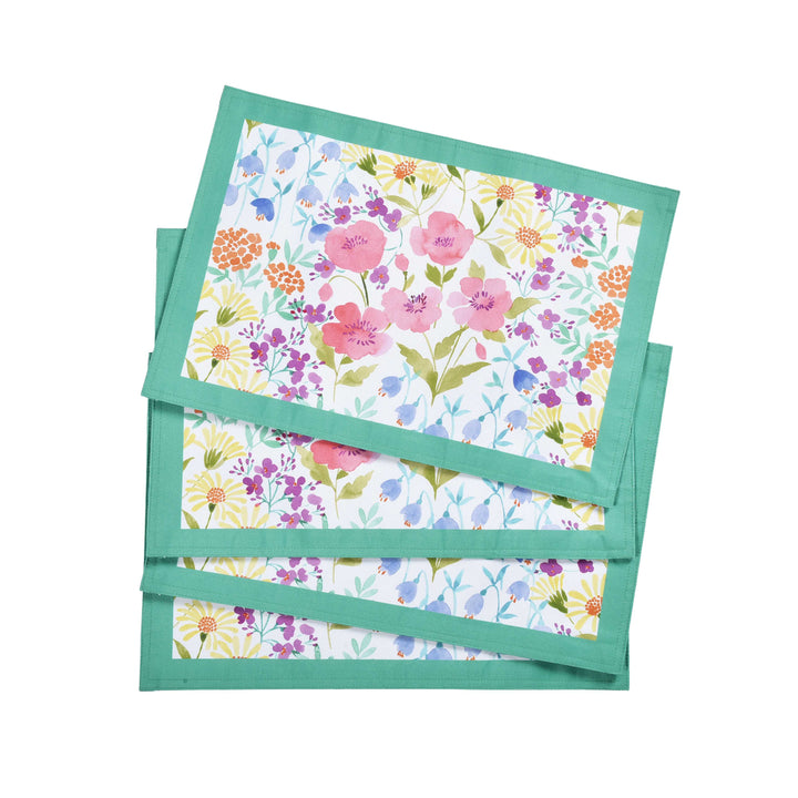 Dress your table decor with fresh flowers and entertain your guests in style with the jules 4 piece placemat set. Printed with a bright and cheerful watercolor floral design in a variety of spring colors. The colorful floral print brings a cheerful and fresh vibe to your décor. Perfect for indoor or outdoor, these pair beautifully with the jules table linens, napkins, and home accents.