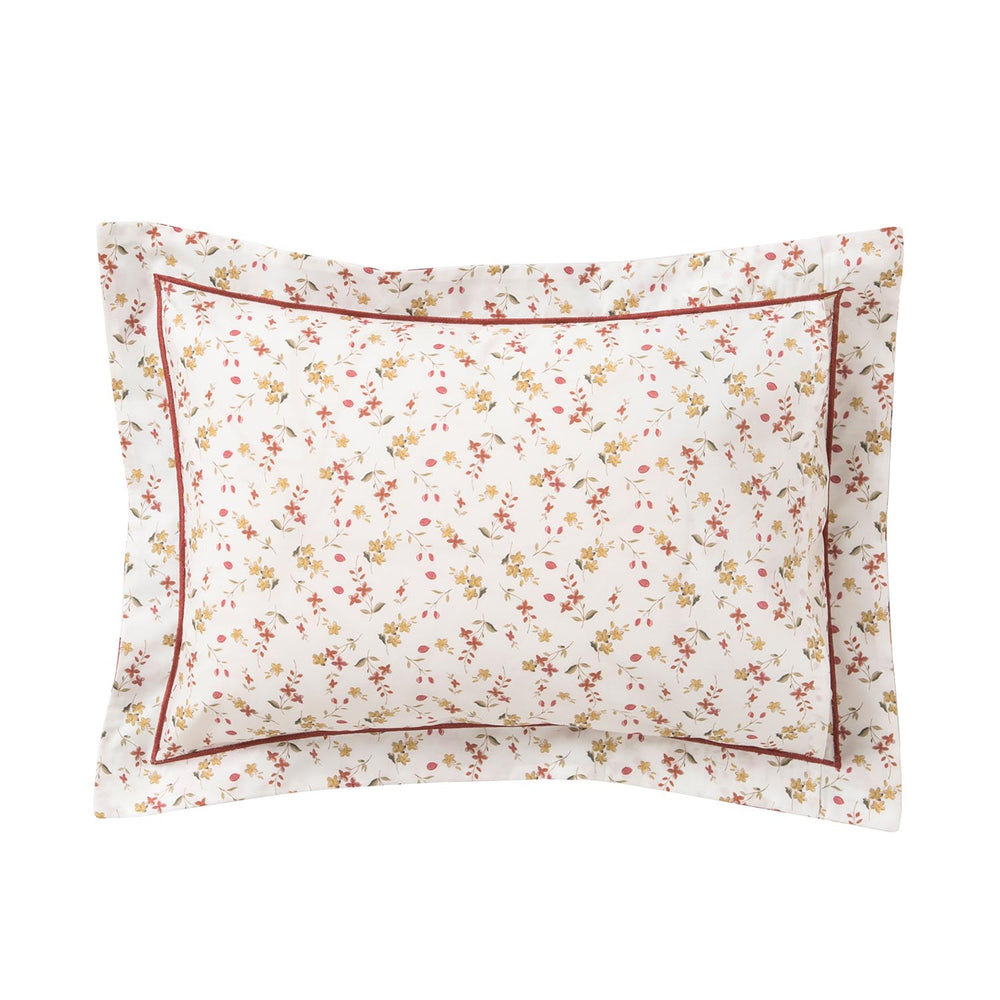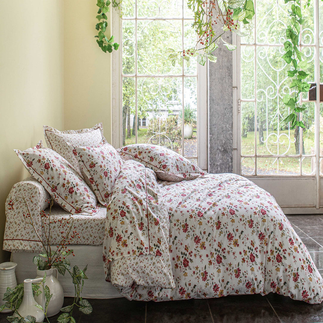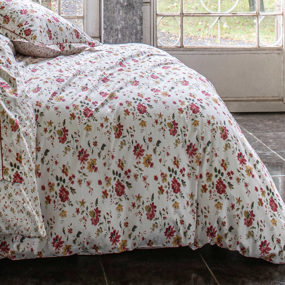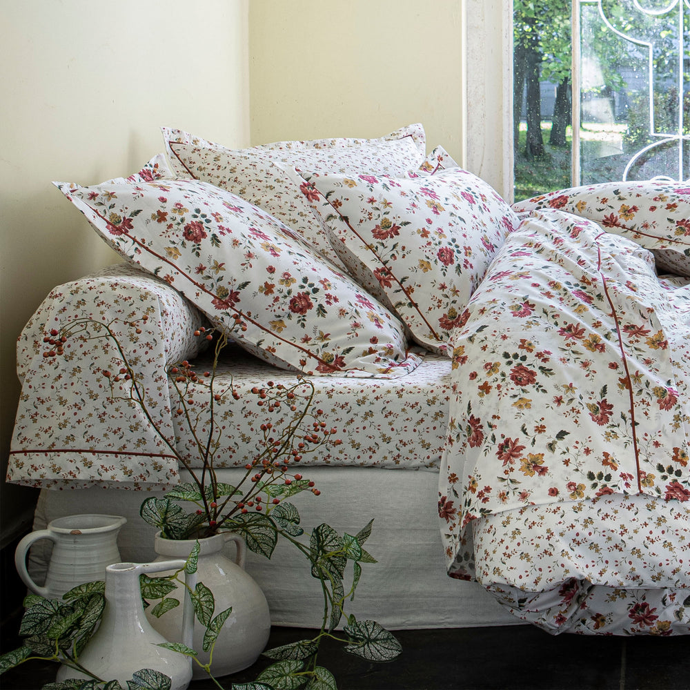 Anna offers a beautiful update on traditional floral printed bedding which combines two different floral prints. With a very happy color palette of greens, reds, and golden yellow - all on a white ground. The two printed designs look hand drawn and colored. Shams match the duvet covers, with the front side having the medium scale Botanical.