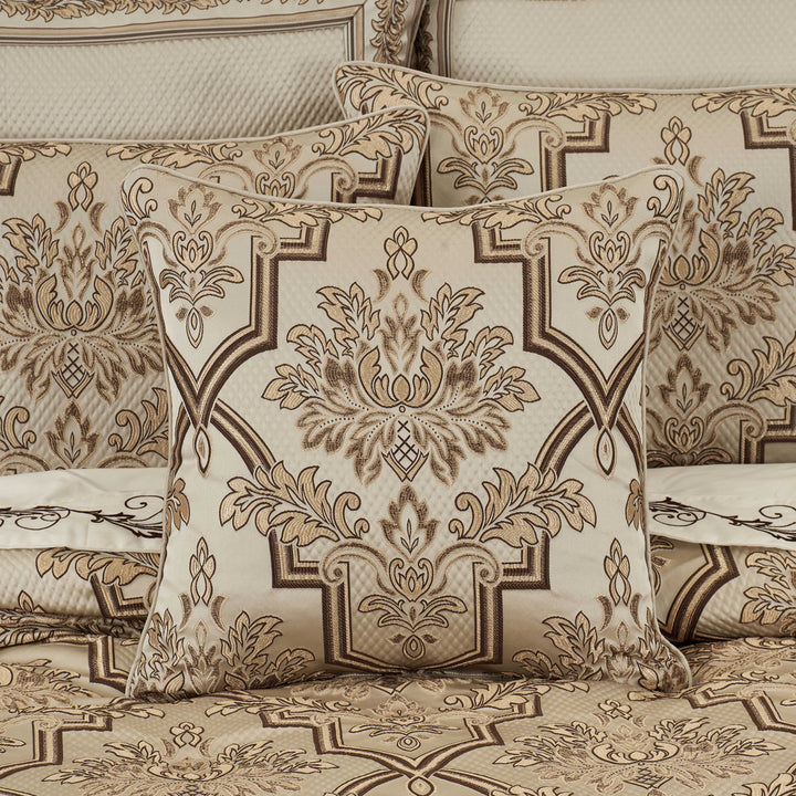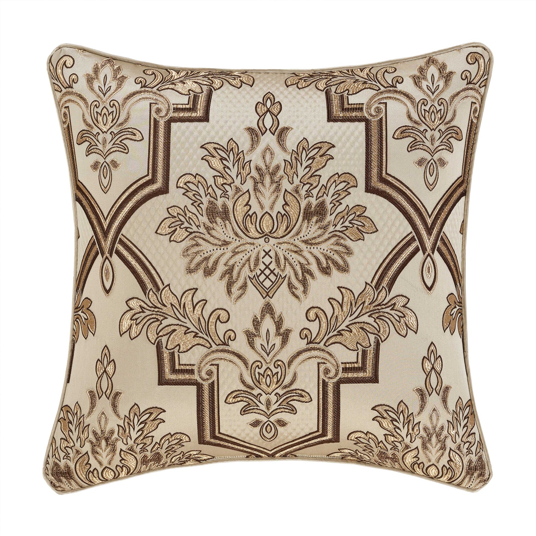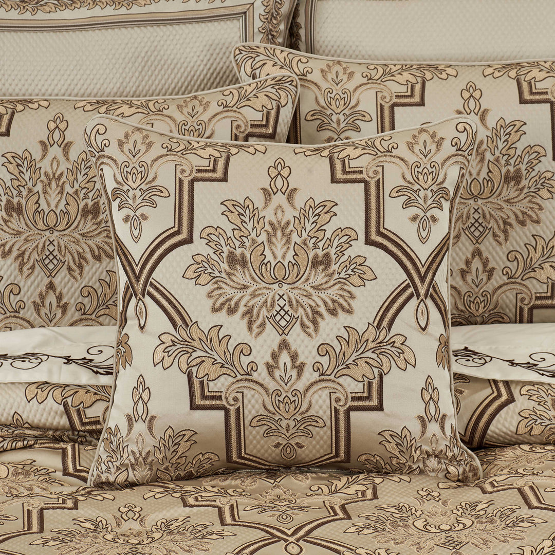The gold coast 20 inch throw pillow features a stunning traditional woven damask in various sand, metallic gold, and chocolate tones. This lovely accent pillow reverses to a woven stripe and is finished with a self-fabric cordage and was designed to coordinate with the gold coast bedding collection.