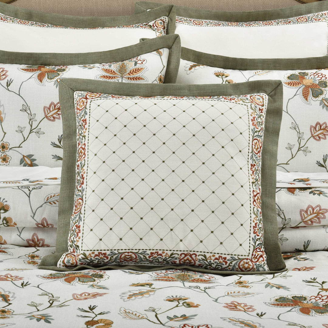 The athena 18 inch throw pillow features a textured faux linen in cream with a sage green embroidered lattice and starburst dot detail. The outside border is framed and mitered on four sides with an intricately embroidered stripe in rust, sage, dark and light teal with accents of gold. A 1.5" folded flange in dusty heathered sage gives this pillow the finishing touch. Pair this pillow with the athena bedding set to complete the look.