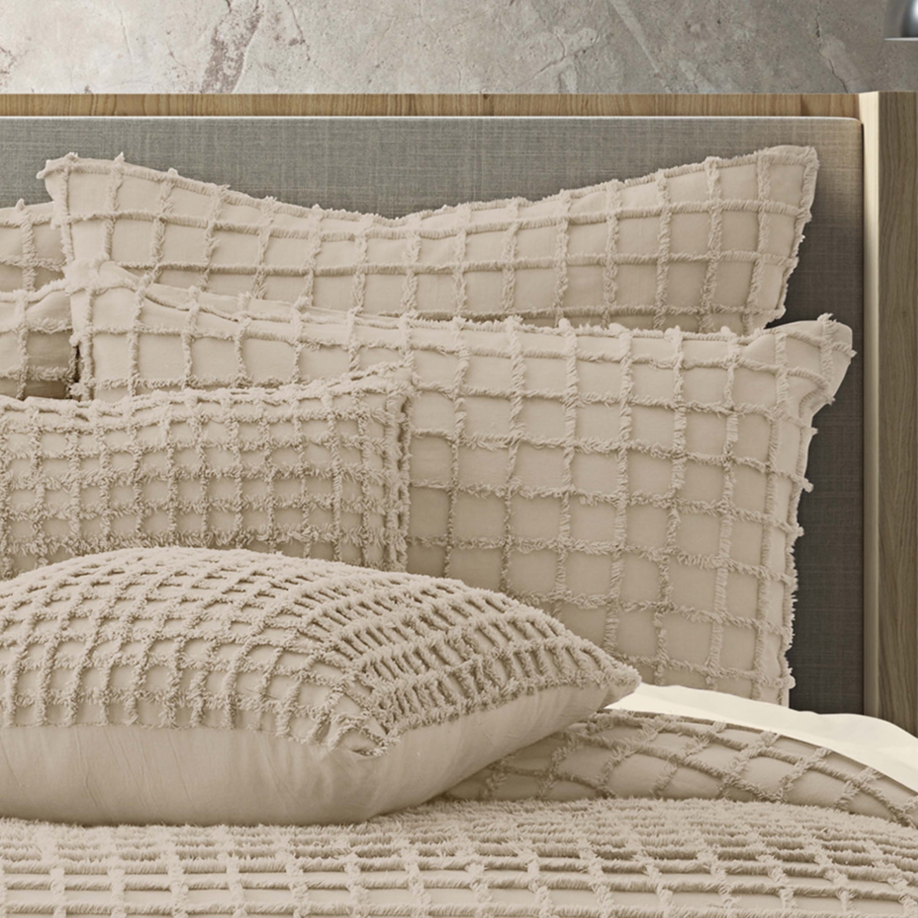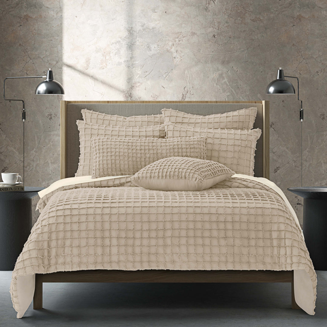 The cameron duvet cover set is constructed in soft cotton that features a candlewick tufting technique, which offers a raised grid pattern for plush and cozy texture. The duvet cover provides an all-season mediumweight versatility, with a hidden button closure, and reverses to a solid cotton fabric for a smooth sleep surface. This ensemble includes two matching pillow shams (1 sham for twin size), is available in multiple on-trend fashionable colors and coordinates with the cameron bedding accessories for a complete modern relaxed boho look.