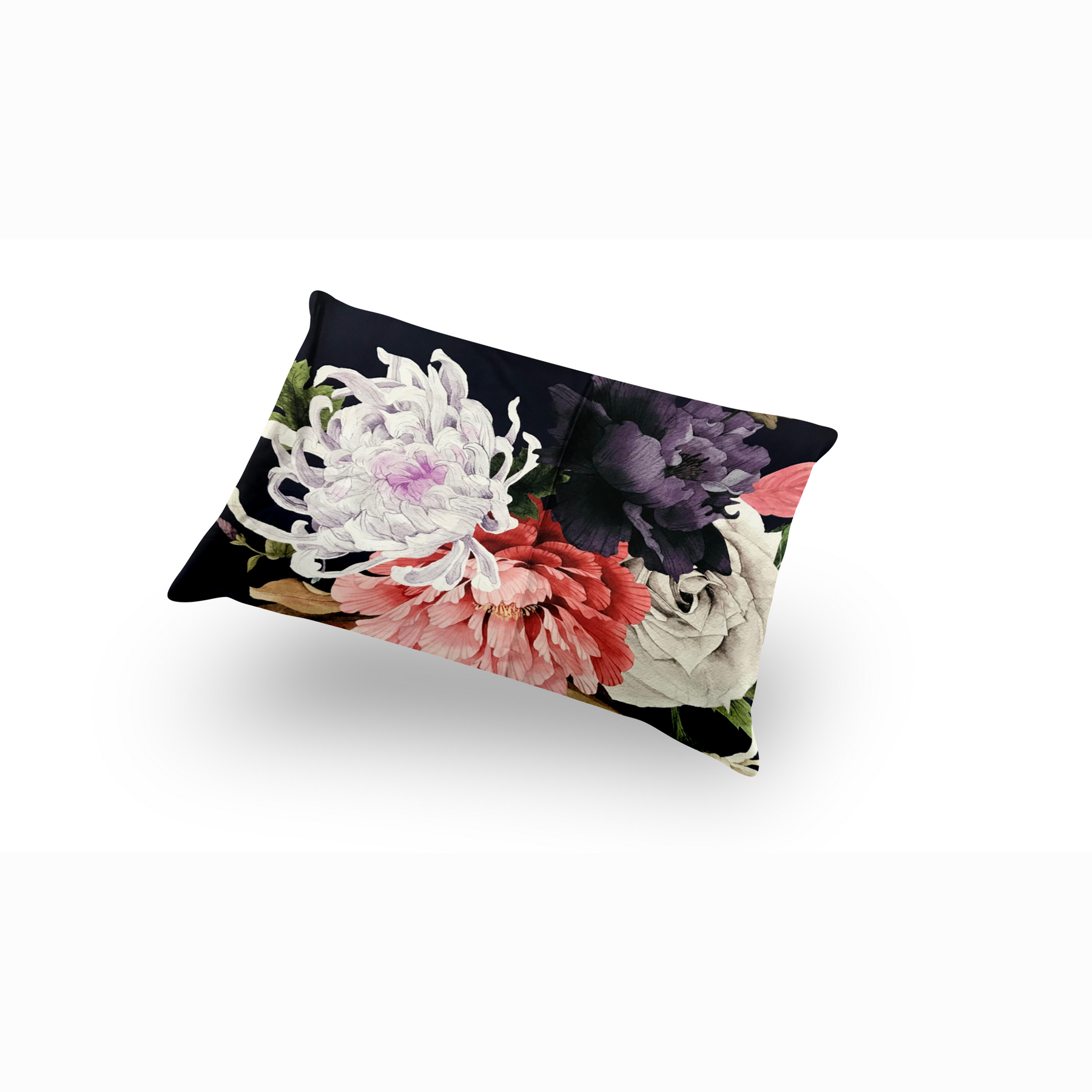 TAs if from an artist’s dream, the deep red, purple, white and peach flowers with green leaves seem to be painted onto a black canvas in the Bebejan Moody Painting 5 piece reversible comforter set.