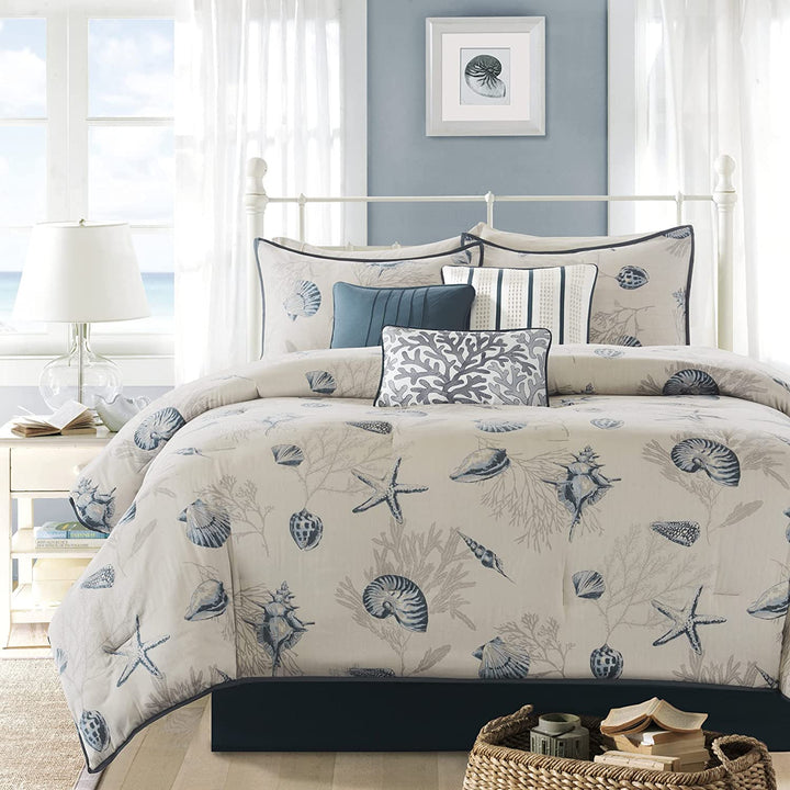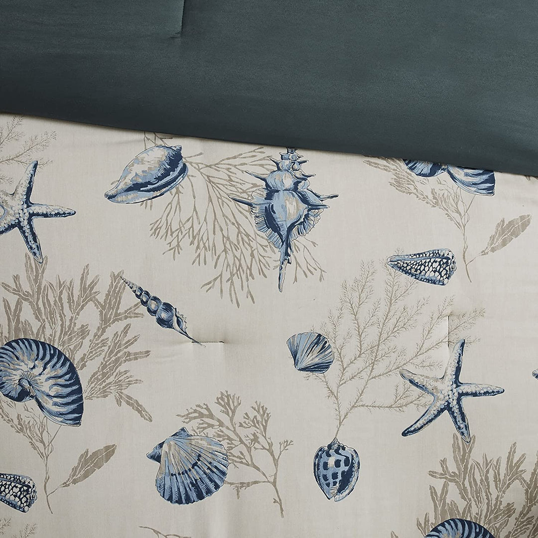 Create a coastal getaway right in your bedroom with the Sea Style Comforter Collection. Made from 200 thread count cotton sateen, the comforter and shams feature assorted seashells accentuated with light and dark blue coloring on an ivory background. In a deep taupe color, a coral motif is printed on the background to give another dimension to this pattern. The reverse of both the comforter and shams is the same corresponding dark blue from the face. Three decorative pillows use pleating and embroidery details for added value to this collection.