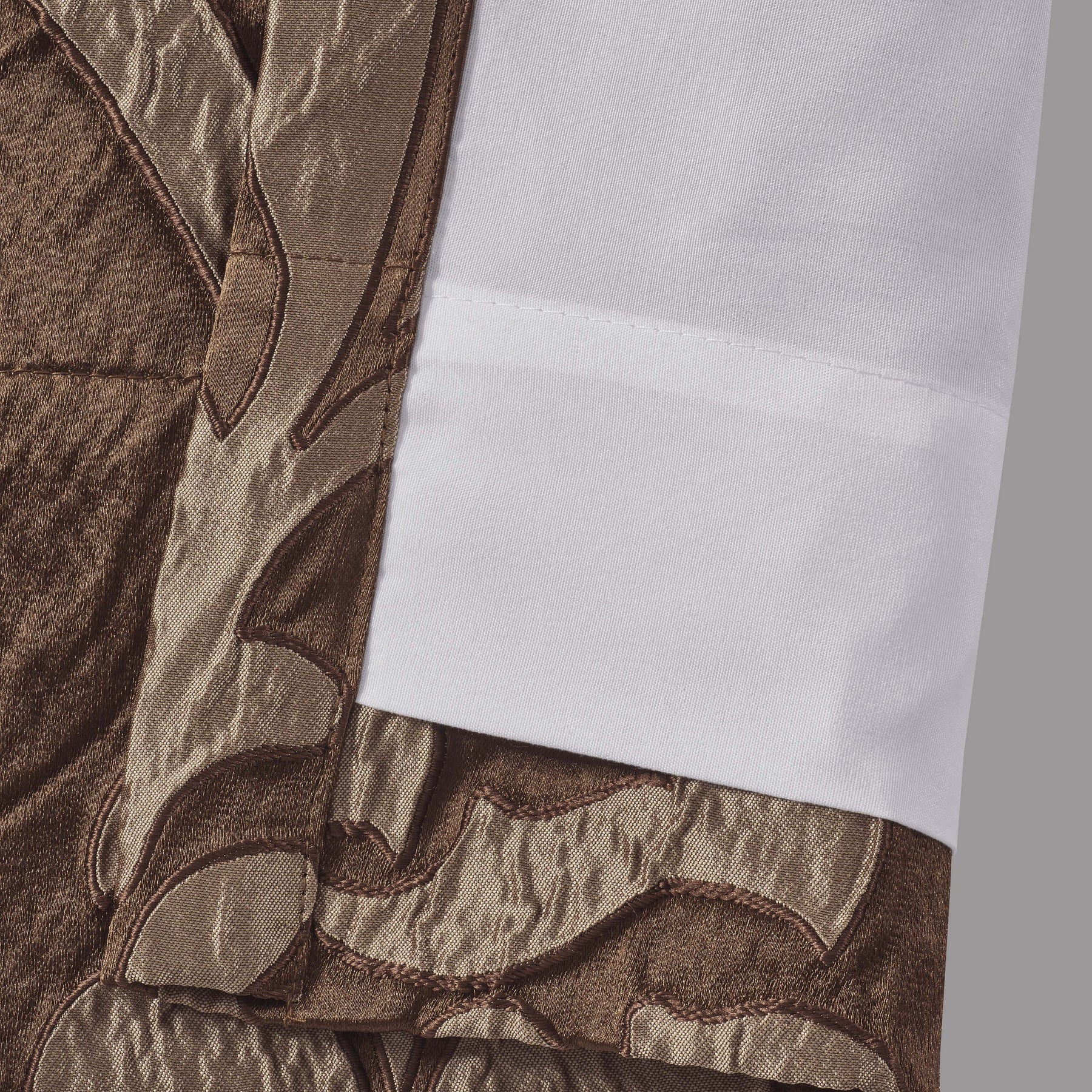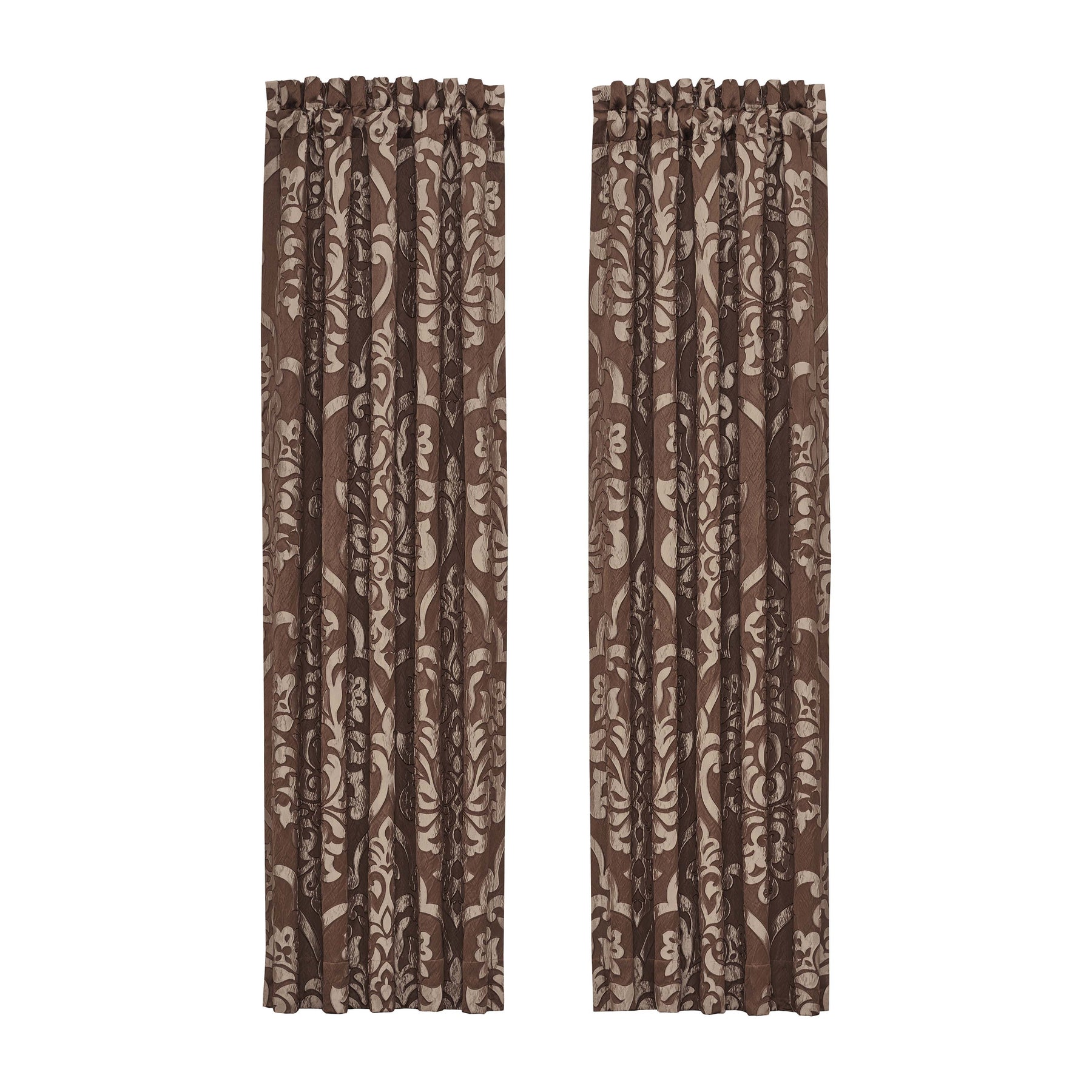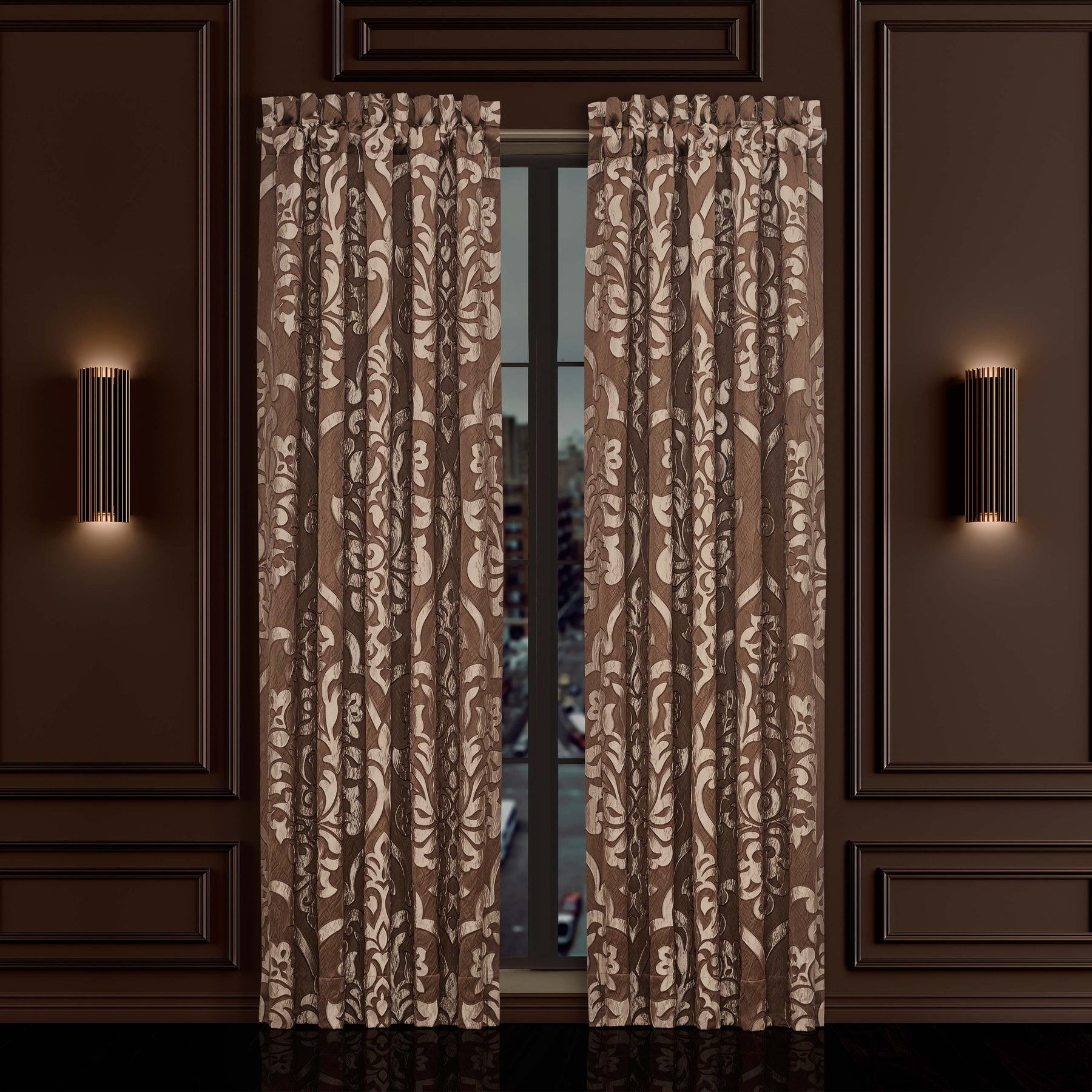 The surano window panel pair is simply stunning with its fine details and sophisticated use of soft copper and beige colors. A timeless woven damask pattern is crafted with a unique fabrication process, giving the appearance of an appliqued technique to finish the grand scale design. The panels are lined for room darkening privacy, include tiebacks, and the 3" header and 3" rod pocket make these panels easy to hang. Pair these panels with the surano bedding set by J. Queen new york for a complete look.