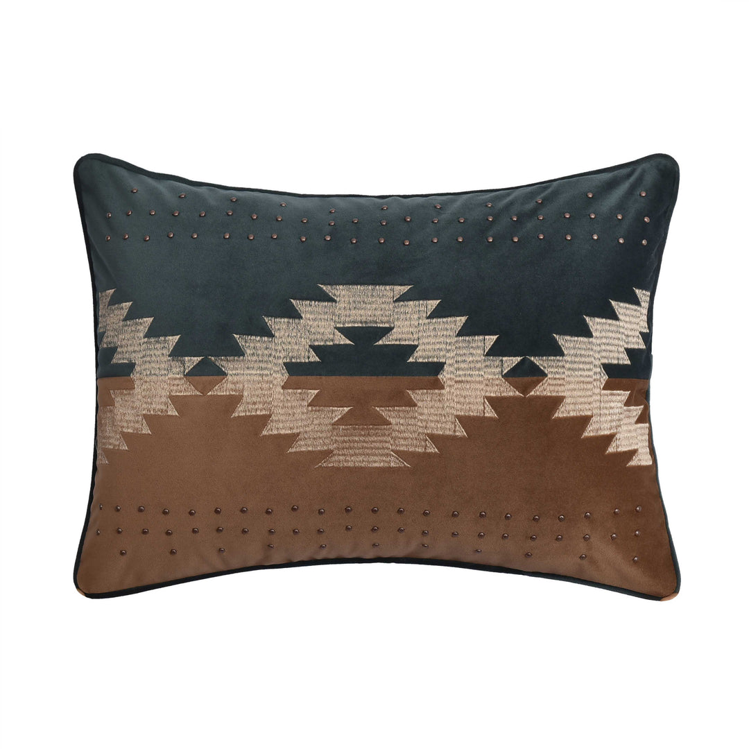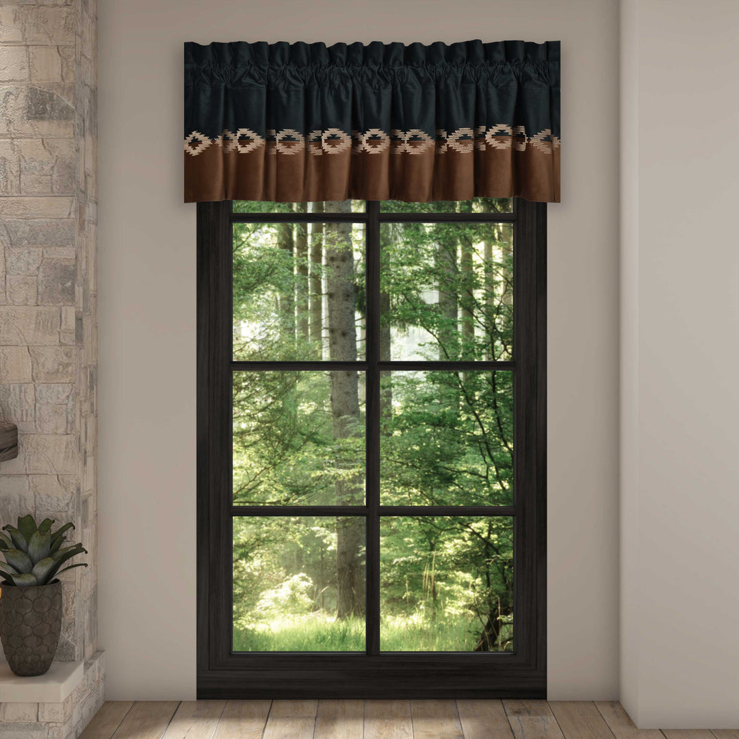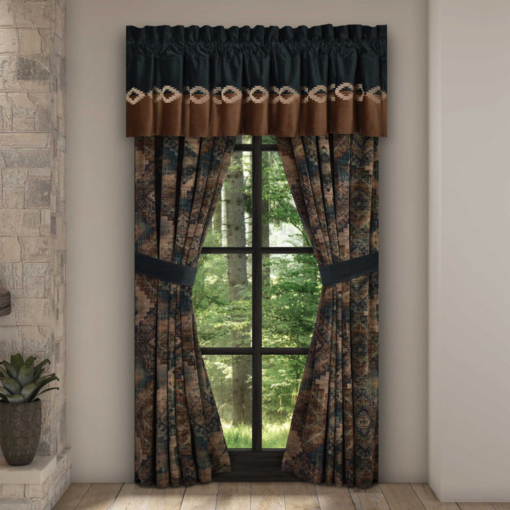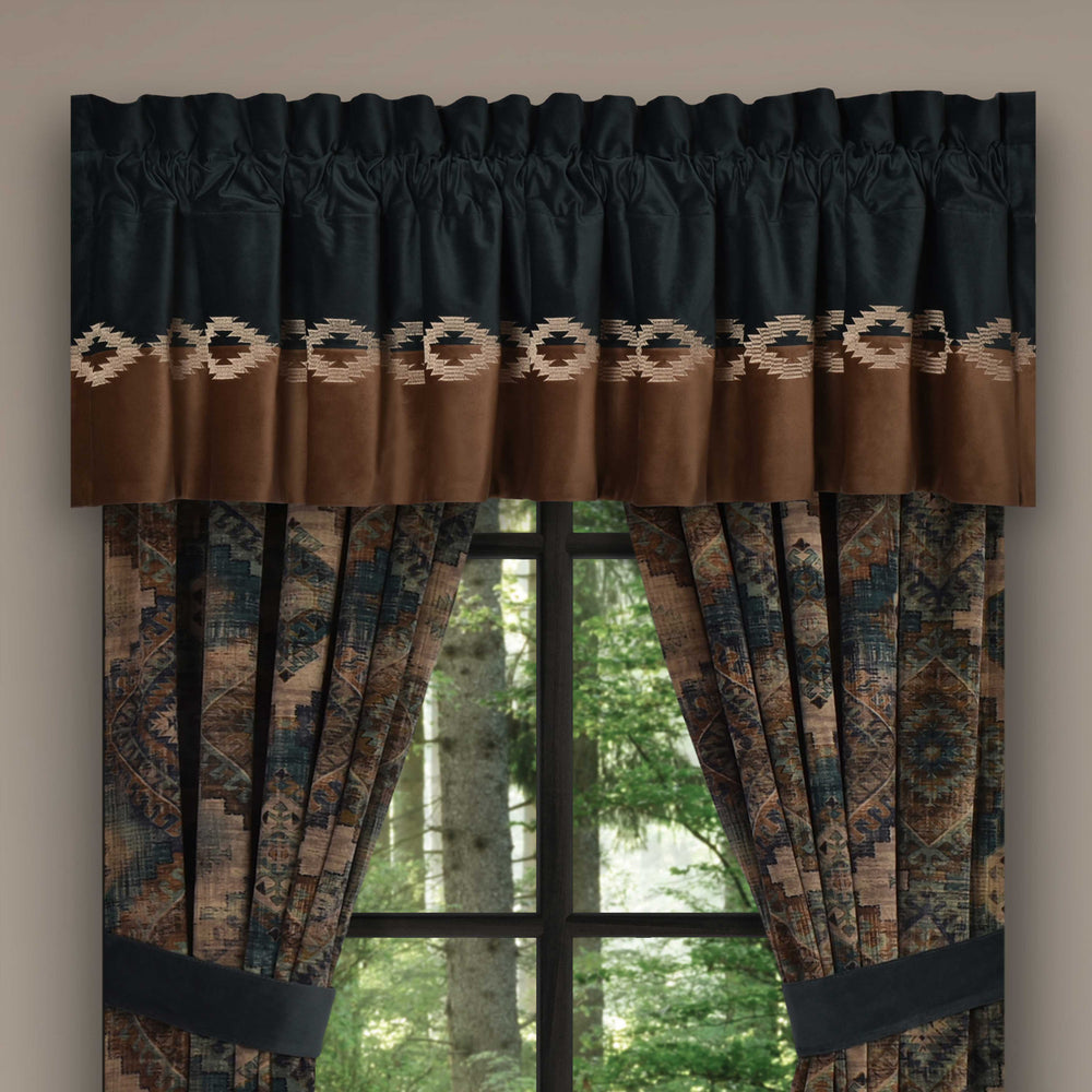The baja window panels feature a bold southwest diamond design in earthy tones of teal, brown, forest green, and beige on a plush velvet fabric. The panels are lined for room darkening comfort and include coordinating tiebacks. Add the baja valance and bedding for a complete elegant look.