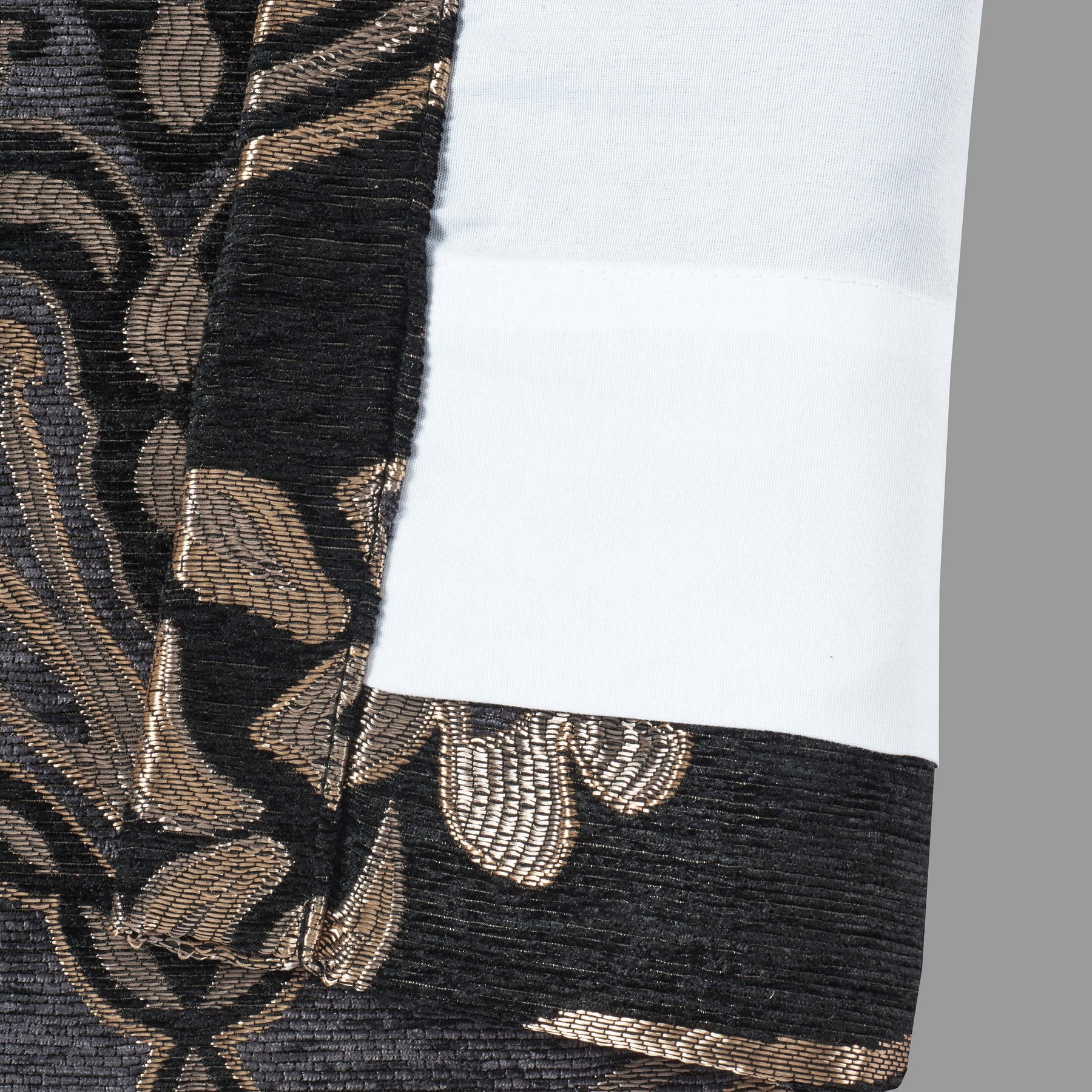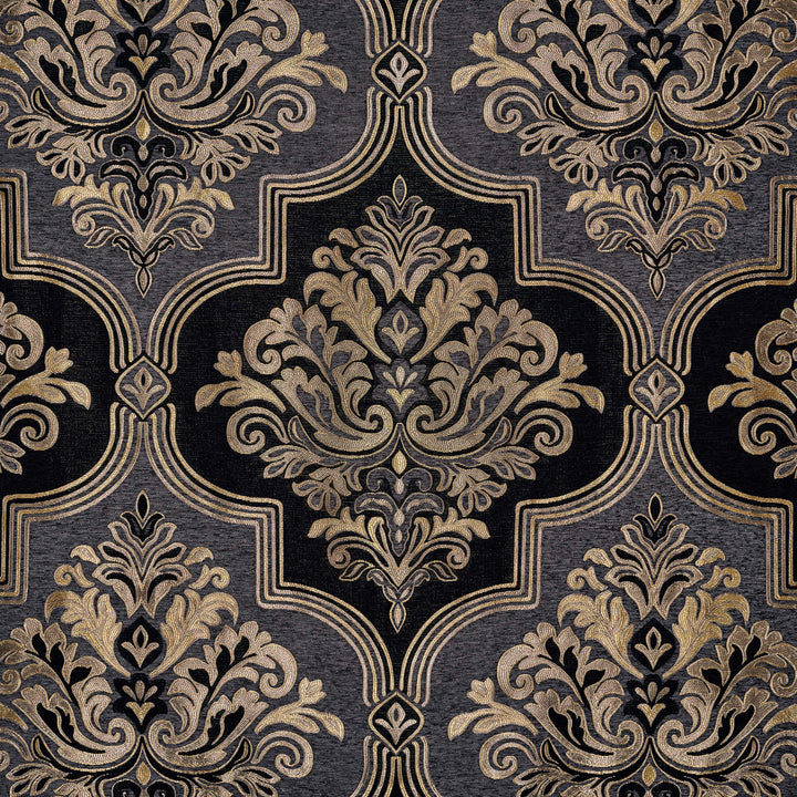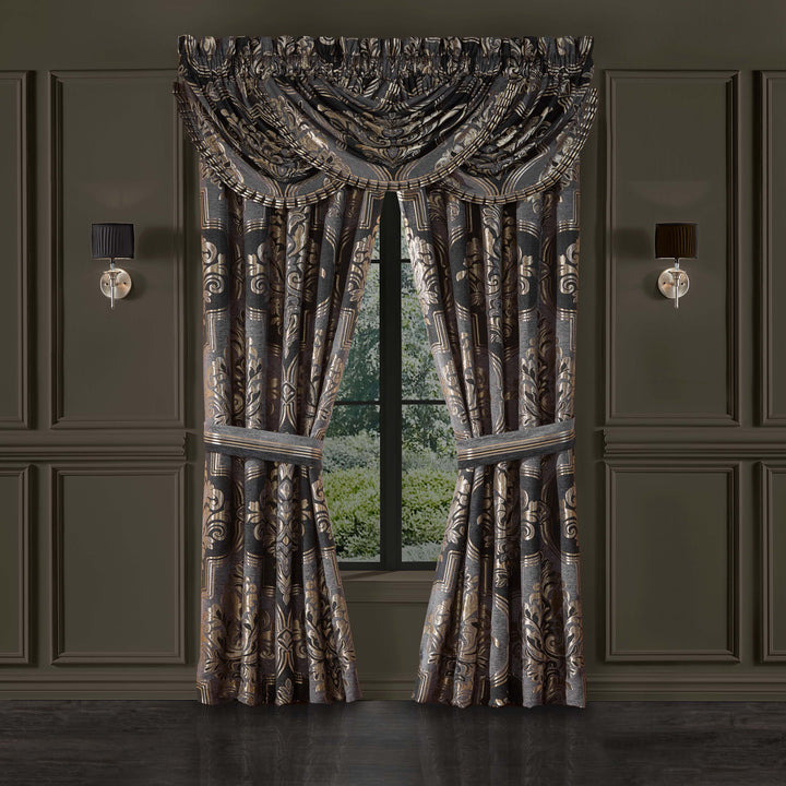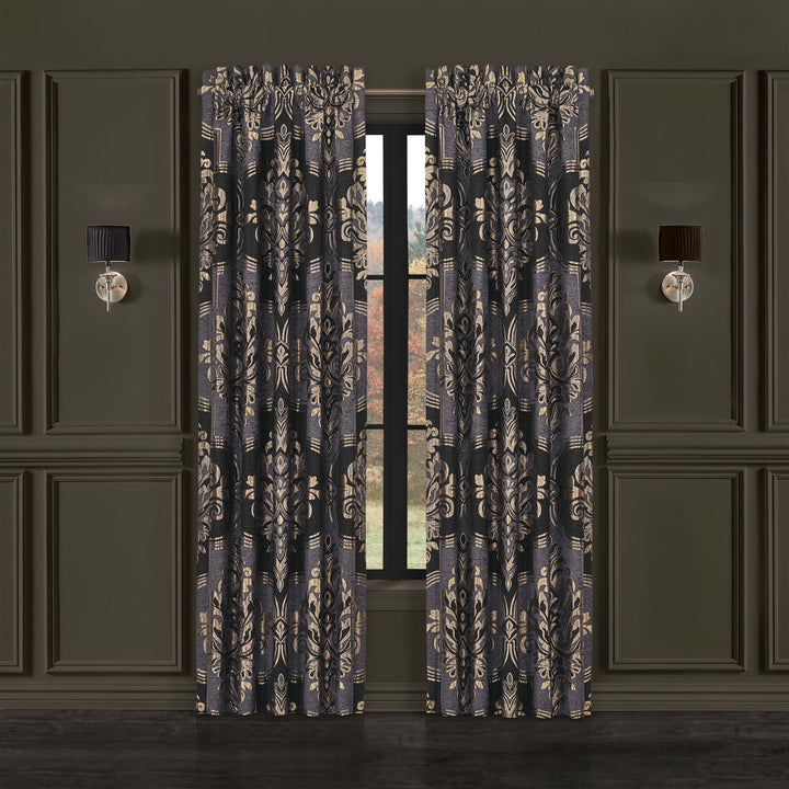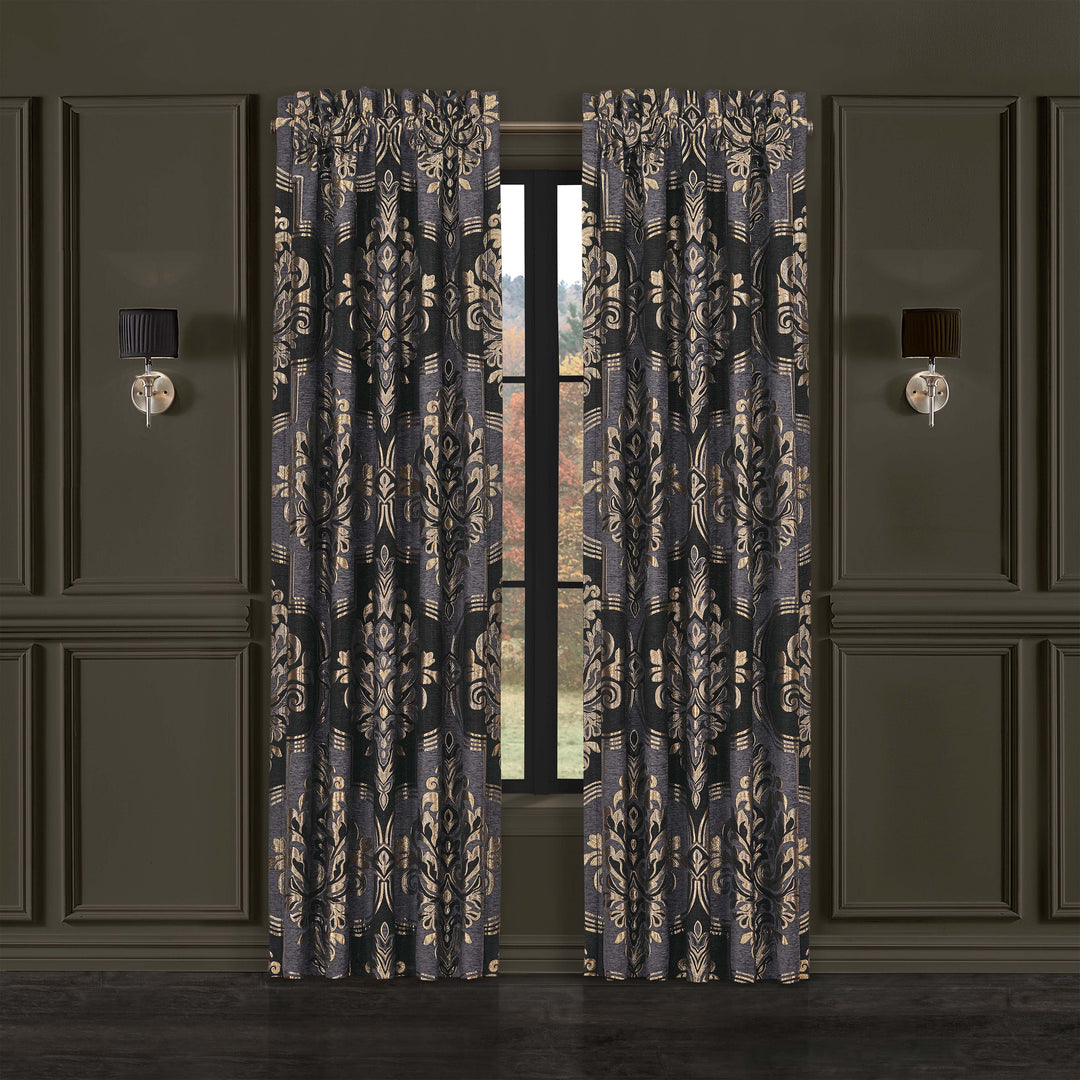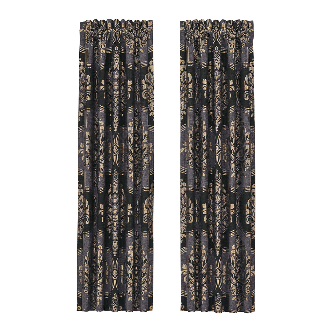 The savoy window panel pair is exquisite with its fine details and dramatic use of black, pewter, and gold hues. A highly engineered framed chenille iron gate damask is centered and cut so each panel is identical and lines up perfectly as a pair. The panels are lined for room darkening privacy, include tiebacks, and the 3" header and 3" rod pocket make these panels easy to hang. Pair these panels with the savoy bedding set by J. Queen new york for a complete look.