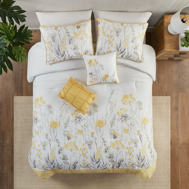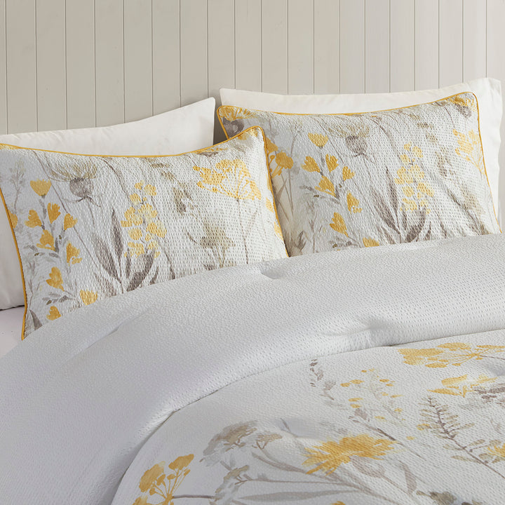 floral print on a white ground and a yellow border at the foot, this seersucker microfiber comforter set exudes a cottage farmhouse style that adds a touch of modern to any bedroom