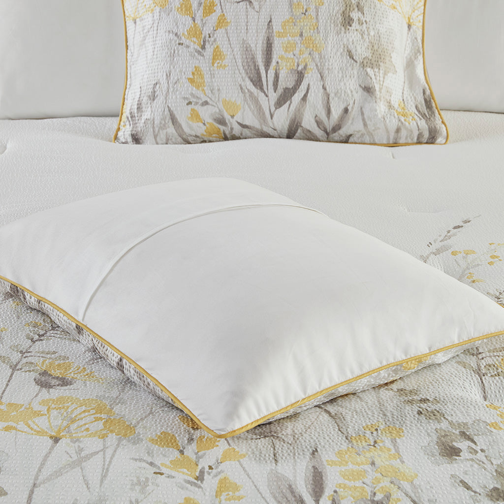 Featuring a floral print on a white ground and a yellow border at the foot, this seersucker microfiber comforter set exudes a cottage farmhouse style that adds a touch of modern to any bedroom. The two decorative pillows feature gorgeous embroidery and ruching that complements the bedding print, adding to the overall charm of the set. Colors featured in this set include shades of grey, taupe, and yellow. The comforter and pillows are filled with hypoallergenic polyester filling that is treated to be dustproof, ensuring a restful and comfortable sleeping experience.