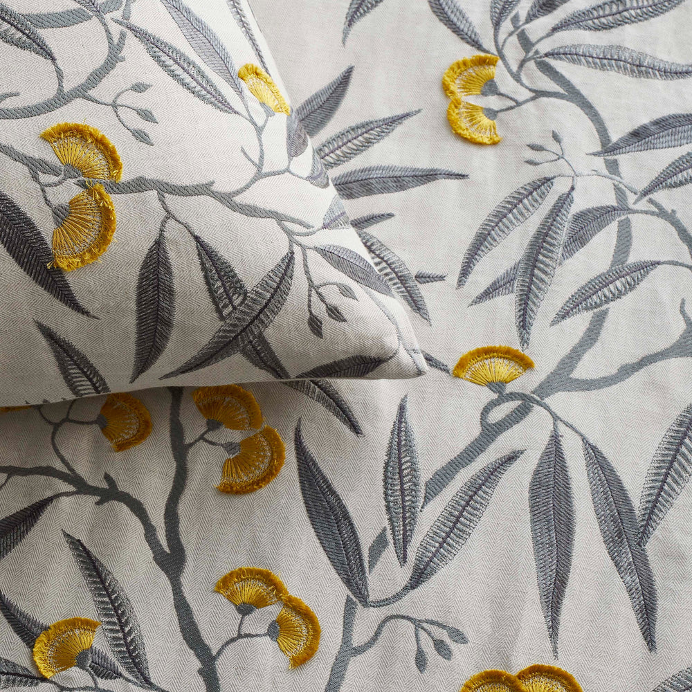 The Art of Home by Ann Gish was created to provide customers with the same quality of goods curated by Ann Gish, at an attainable price point. The products from this collection are sure to elevate any space. Our designs rely on elegance that is easy and pleasurable to live with, achieved through a marriage of form and function. It is luxury created for and enjoyed by the senses. This graceful pattern of greens, ambers, and tans is digitally printed onto a linen blend. Inspired by an Egyptian floral plaque, Alyssum's delicate, fringed flowers and grey leaves are embroidered onto a herringbone ground.