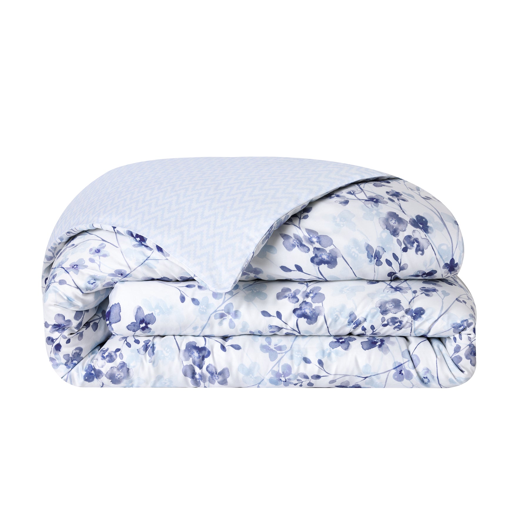 Calme is a modern blue-on-white design of flowering Japanese Quince watercolored flowers coordinated with a sophisticated textured blue-on-white chevron print. Together the two prints combine to make a most beautiful bedding design which speaks of ephemeral beauty. Calme offers one an architectural approach aimed at living a true emotional and spiritual experience by reconnecting with oneself and the environment. A place that promotes a meditative state and wonder in the face of landscapes, seasonal cycles, or living elements. Admire the snowpack of the garden and lull your imagination to the natural rhythm of the winter light. Japanese Quince (Chaenomeles japonica) start to bloom during the cold winter months, even in snow. Their delicate flowers stand out on the naked branches, offering a respite against the gloom of winter. In Art, the Japanese Quince flowers have significant cultural meaning and personify elegance and resilience. Calme duvet covers have the flowering branches print on one side and the very modern textured chevron print on the other side.