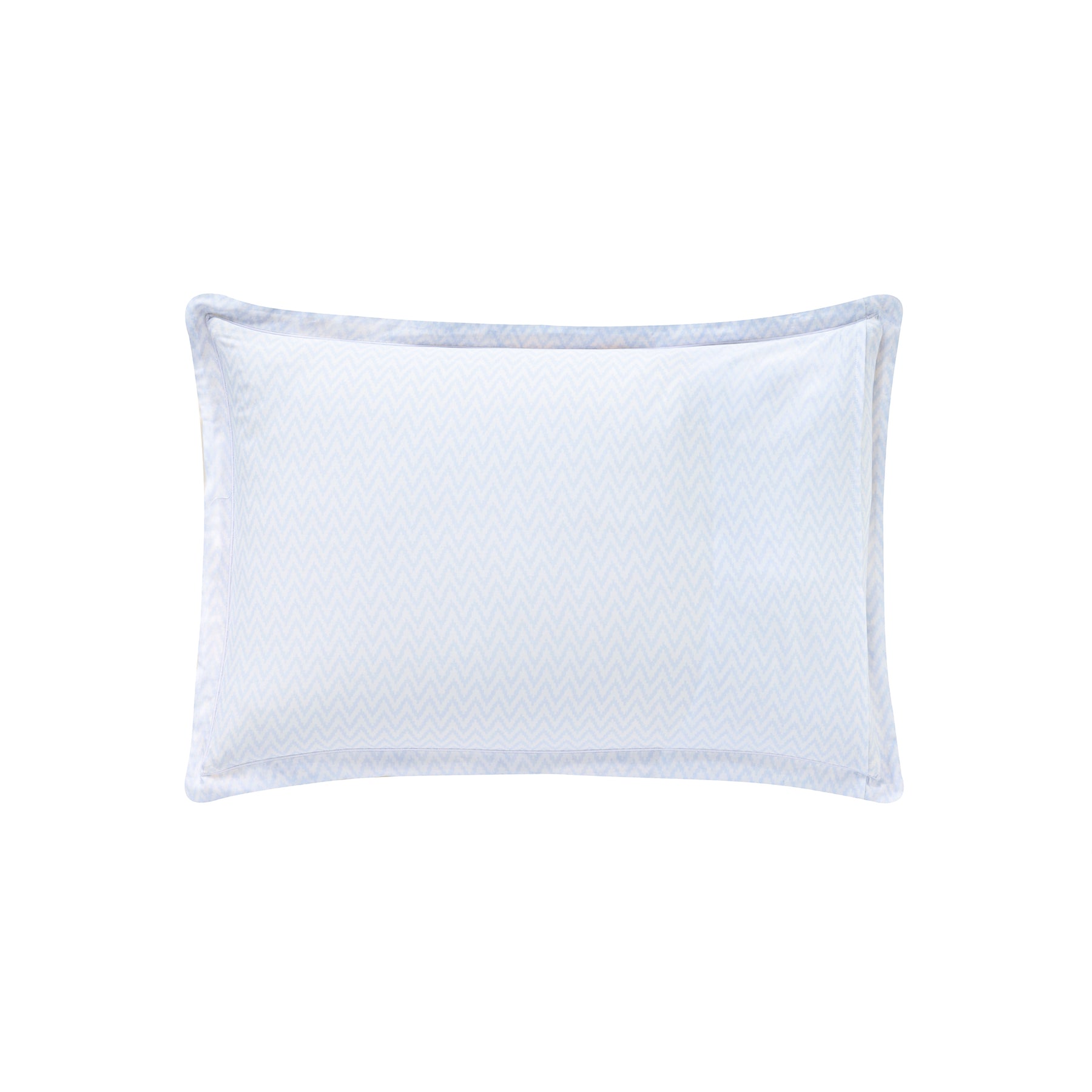 Calme is a modern blue-on-white design of flowering Japanese Quince watercolored flowers coordinated with a sophisticated textured blue-on-white chevron print. Together the two prints combine to make a most beautiful bedding design which speaks of ephemeral beauty. Calme offers one an architectural approach aimed at living a true emotional and spiritual experience by reconnecting with oneself and the environment. A place that promotes a meditative state and wonder in the face of landscapes, seasonal cycles, or living elements. Admire the snowpack of the garden and lull your imagination to the natural rhythm of the winter light. Japanese Quince (Chaenomeles japonica) start to bloom during the cold winter months, even in snow. Their delicate flowers stand out on the naked branches, offering a respite against the gloom of winter. In Art, the Japanese Quince flowers have significant cultural meaning and personify elegance and resilience. Calme shams ahave an envelope enclosure which hides the pillow insert from view and embellished with a white Bourdon embroidered line finishing detail.