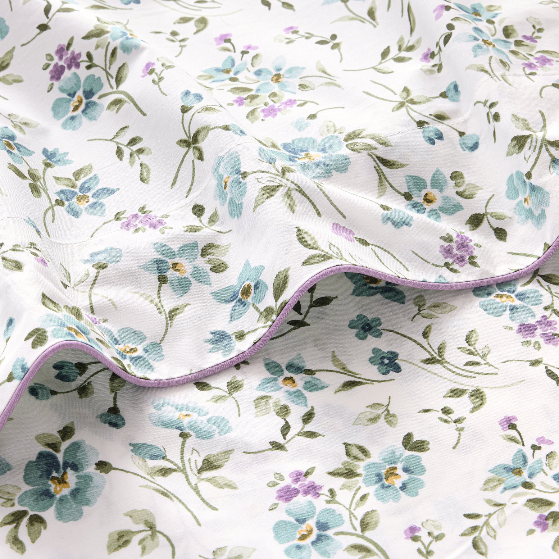 Fugace is a celebration of the senses. Flowers subtly invite themselves into this space of pure lines, forming a harmonious bridge between nature and architecture. Their delicate motifs infuse a touch of humanity and poetry, becoming a discreet accent, a delicate and perfectly mastered note. They awaken our senses, inviting contemplation and an intimate connection with the living. In Art, periwinkle flowers are said to impart a sense of calmness, spirituality, and peace, and are a symbol of love, hope, and strength. Fugace is the French word for fleeting, as in the periwinkle flowers which bloom for only a short period of time. The flowers print and the horizontal stripes print are done on a warm white ground. Fugace flat sheets have the all-over flowers print. Percale construction, 200 TC, made of 100% long-staple combed Organic cotton. Made in France.