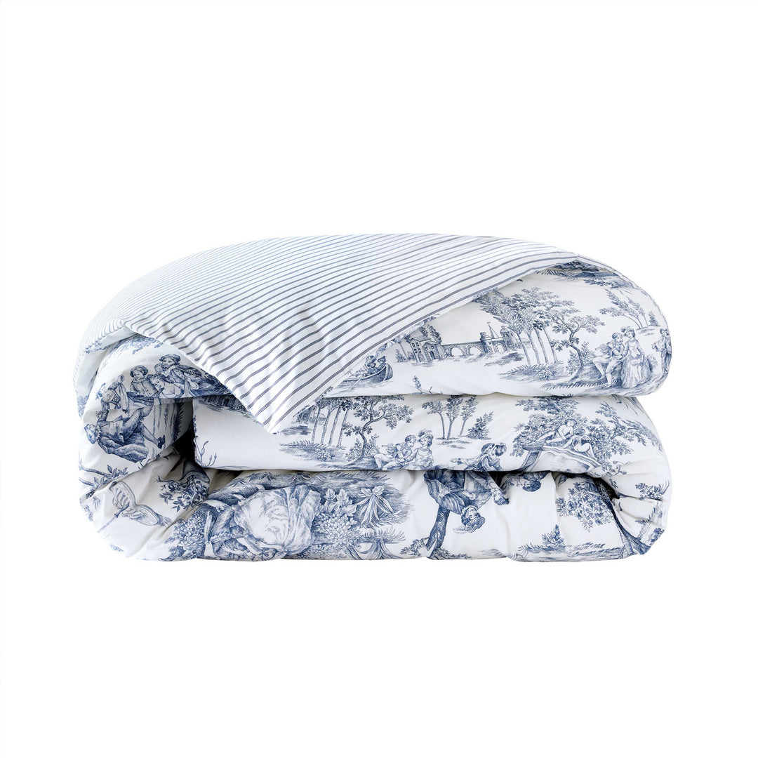 Galante printed duvet covers are reversible. One side has the Toile de Jouy print, the other side has the three-lines stripes print. Galante Toile de Jouy bedding print is from a 1780 drawing depicting love and gallantry. Percale construction. 100% Organic, long-staple combed cotton. Made in France.