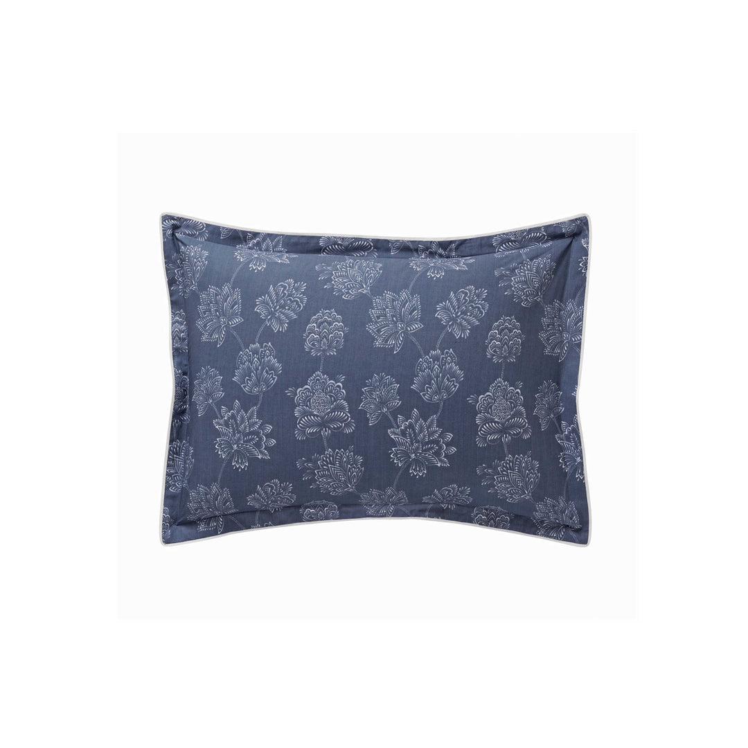 Nocturne gives free reign to an ornamental aesthetic by combining stylized florals and men's wardrobe. The result is modern, and very handsome, a combination of Persian flowers and men's suiting stripes. Both prints are on a denim blue background. Percale construction. Nocturne pillowcases are embellished with a light beige coloured inset trim finishing detail.