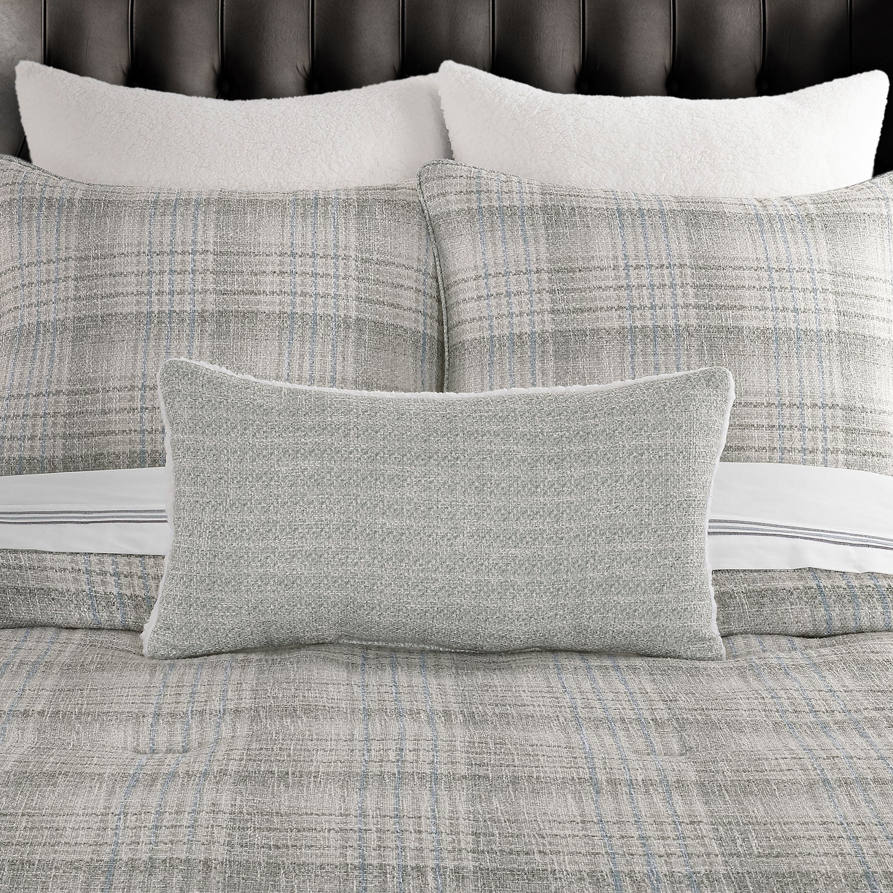 The alejandro boudoir throw pillow offers a cozy contemporary design that works all-year-round. Featuring a woven textured pattern, paired with a cozy sherpa on the reverse, allowing you to change up your decor anytime. Complete the alejandro collection with the luxurious bedding and window treatments (each sold separately).
