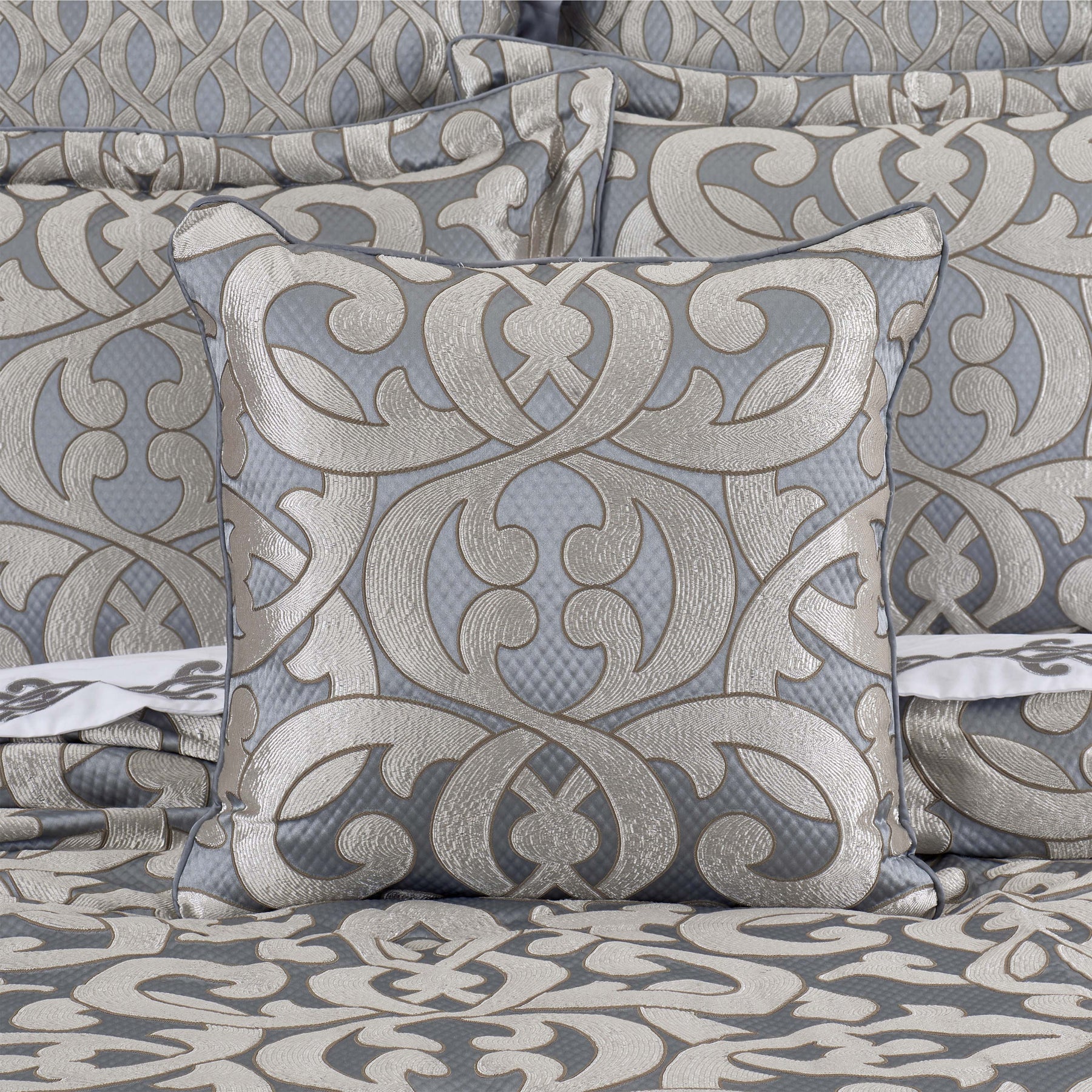 the lovely 20€� square throw pillow is a perfect decorating accessory not only to complete the bedding ensemble but as an elegant accent in other areas of the home. each pillow is cut and sewn exactly the same. showcasing the large sterling silver damask on one side and a stunning geometric pattern on the other for added versatility. a small soft satin cord finishes the pillow on all four sides. pair this pillow with the barocco bedding set by j. queen new york for an updated luxe look.