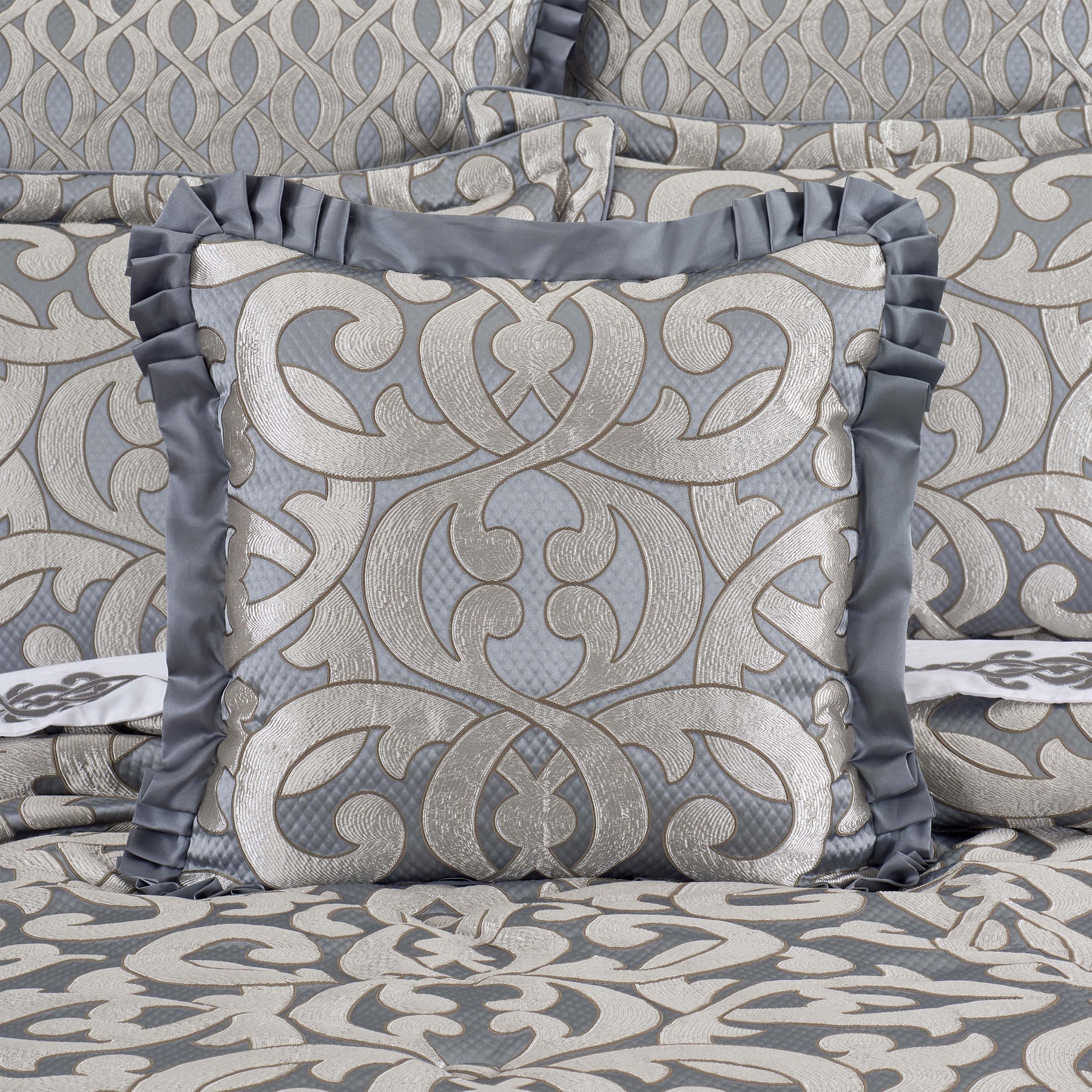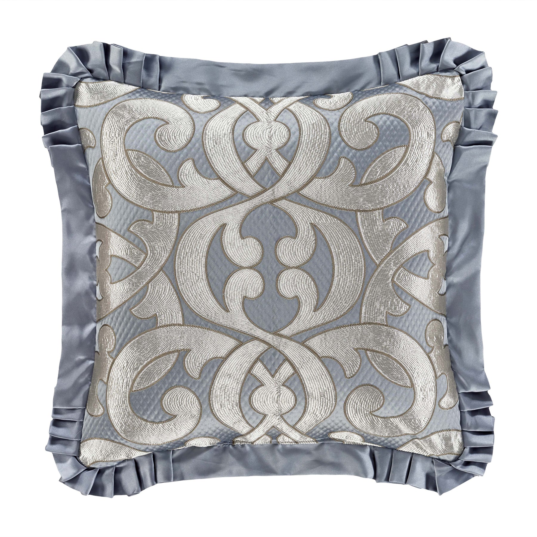a generous 20€� embellished square throw pillow is a perfect decorating accessory not only to complete the bedding ensemble but as an elegant accent in other areas of the home. each pillow is cut and sewn exactly the same. showcasing the sterling silver ivory damask on one side and a stunning geometric pattern on the other for added versatility. a lovely pleated flange finishes the pillow for a tasteful decorator's touch. pair this pillow with the barocco bedding set by j. queen new york for an updated luxe look.