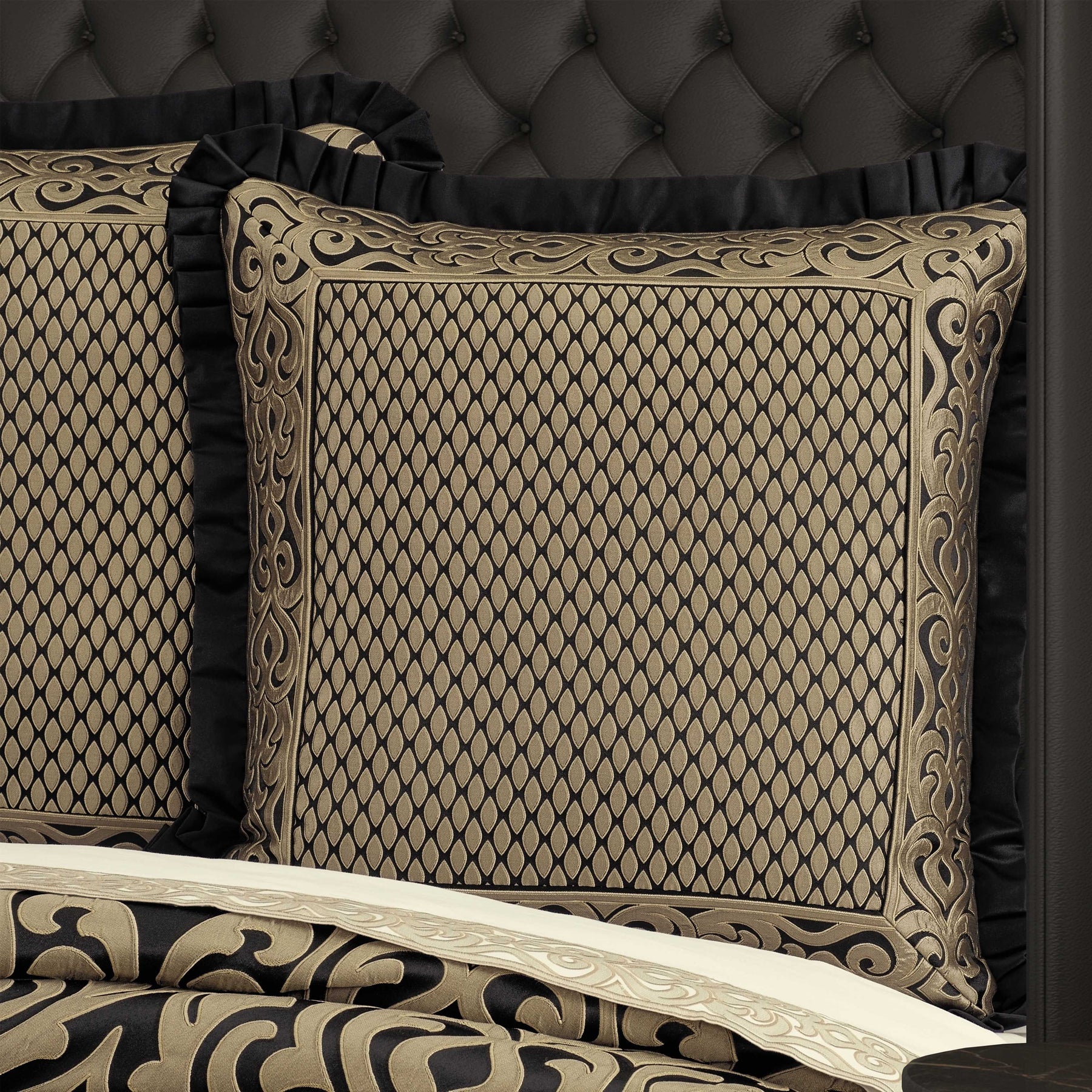 The bolero euro sham features a black and gold tear-drop diamond pattern, finished with a scroll border design to create a dramatic frame. Trimmed with a decorative flange that is pleated on all corners with a stria satin fabric. This highly detailed euro sham is made to coordinate with the bolero bed set for a complete look.