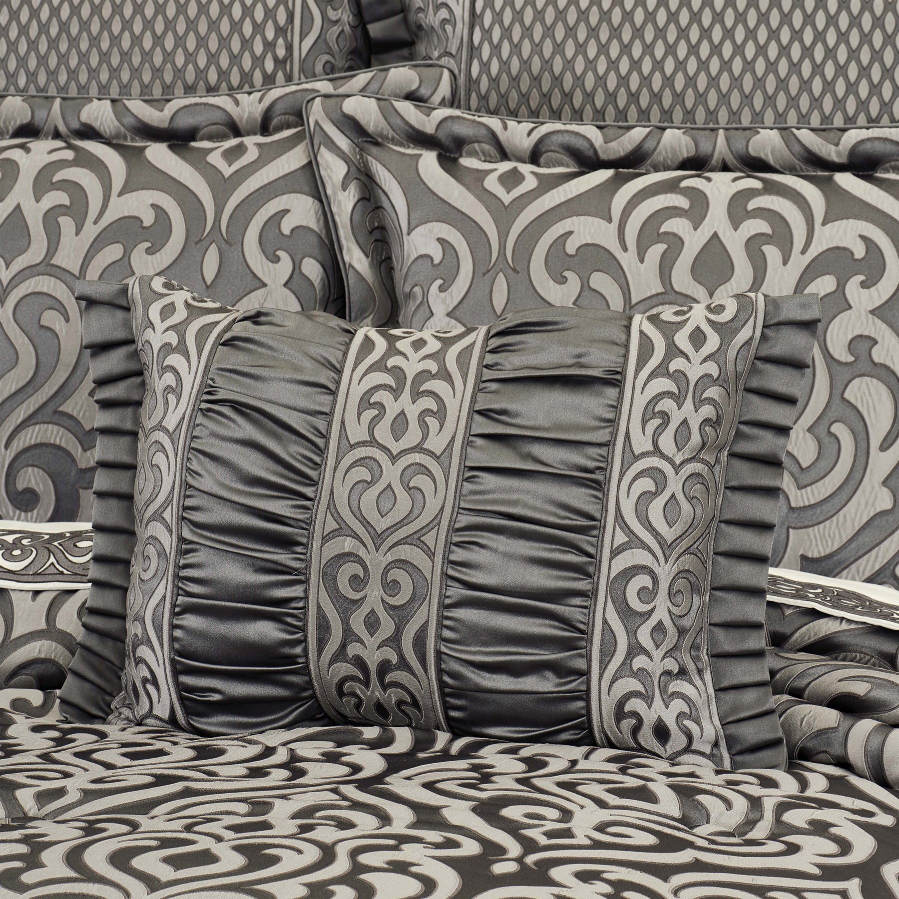The hand crafted bolero boudoir pillow adds dimension to the ensemble with an ornate border design highlighted on both sides, paired with a unique rouched pleating technique cut from a silver and gray stria satin. The accent pillow is finished with a pleated flange and reverses to a tear-drop diamond coordinate that is made to coordinate with the bolero bed set.