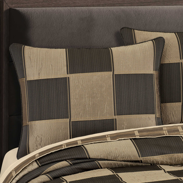 Modern, bold, and sophisticated geometric blocks give the brando 4 piece comforter set a streamlined appearance. Dimensional and multi textural techniques combined with a stria warp that is woven into the contemporary design, give the collection an industrial look with a graphite, charcoal and bronze color combination. The pillow shams are meticulously cut and sewn, positioning the pattern perfectly in the center and the bed skirt is carefully crafted with kick pleats to add a luxurious tailored touch. Pair this bedding collection with the brando throw pillows, euros, and window treatments for a complete look.
