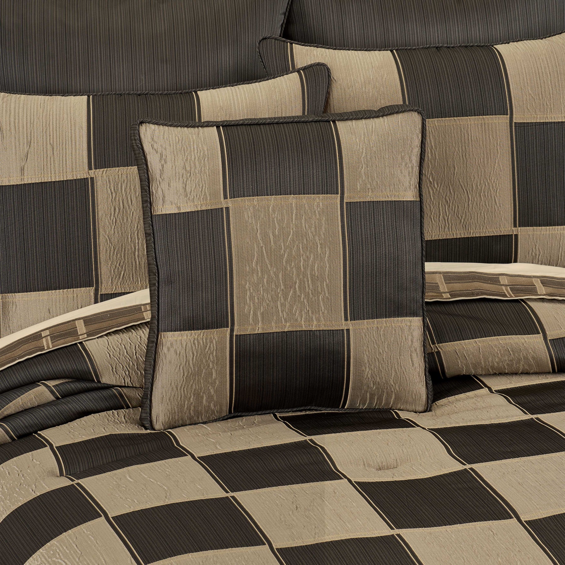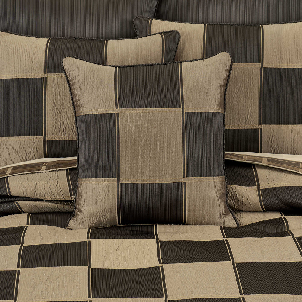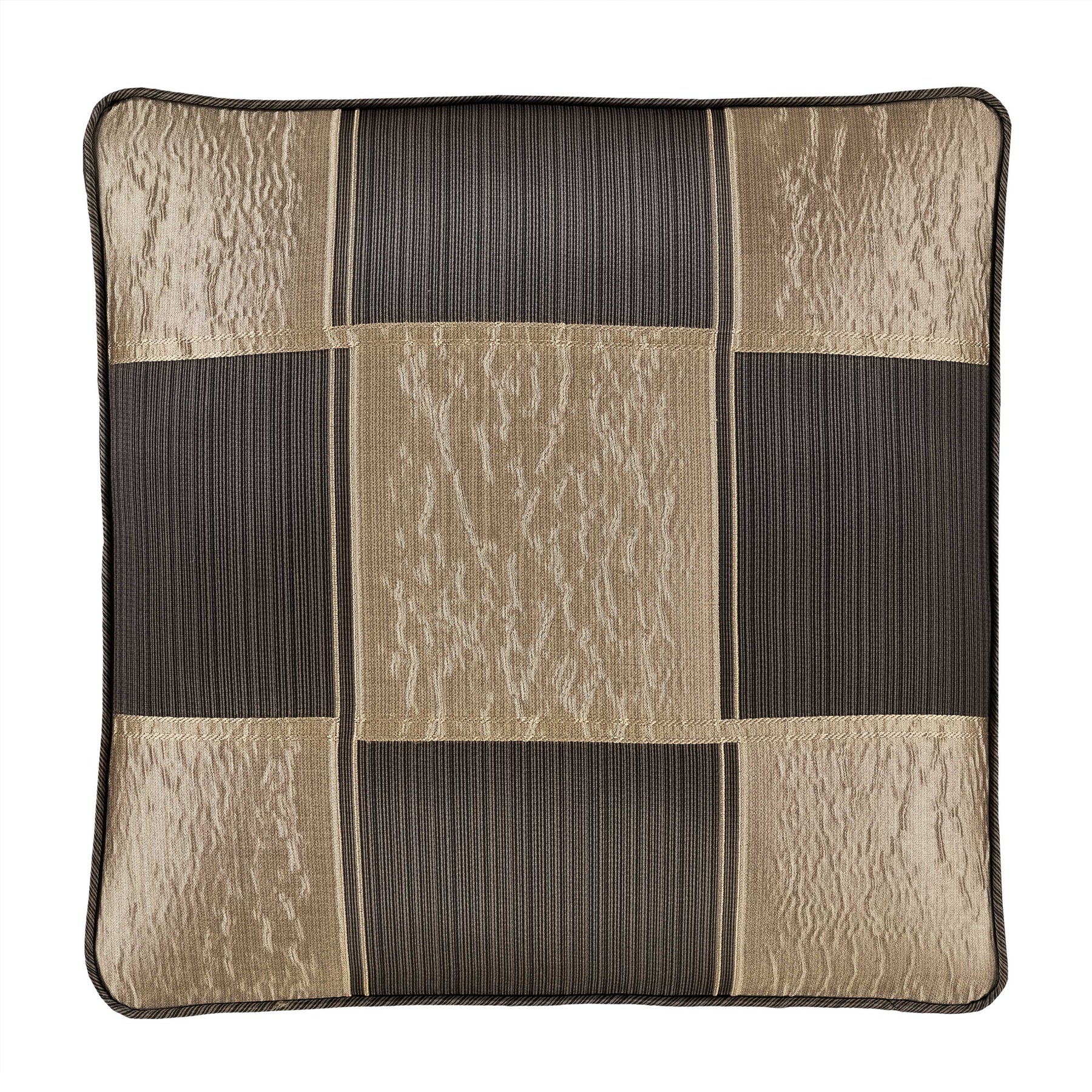 Modern, bold, and sophisticated, the brando 18" decorative throw pillow is engineered with a highlighted block design in glimmering graphite, charcoal and bronze tones. The 2 inch gusset is detailed with a stria satin and completely finished with stria satin piping for a tailored finish. Pair this pillow with the brando bedding set by j. Queen new york for a fresh contemporary look.