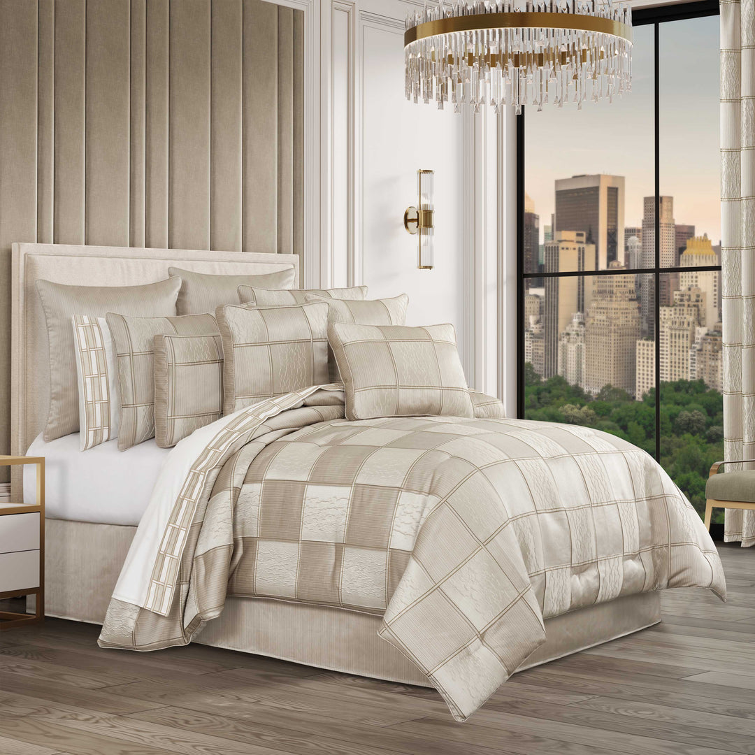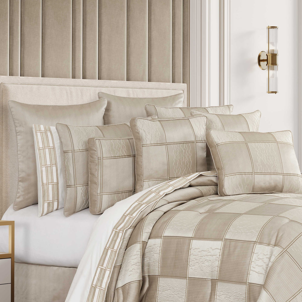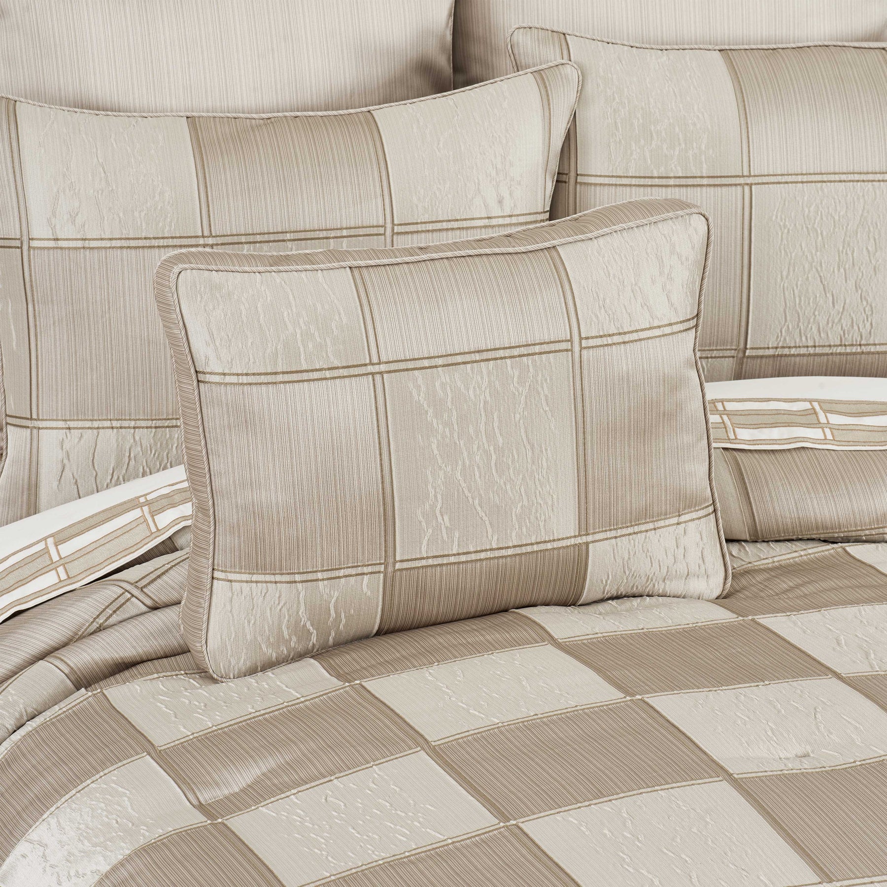 The modern brando boudoir pillow adds dimension and loft with its box gusset style construction. The metallic flax color accent pillow is designed with geometric blocks and is finished with satin piping, which is made to coordinate with the brando bed set.