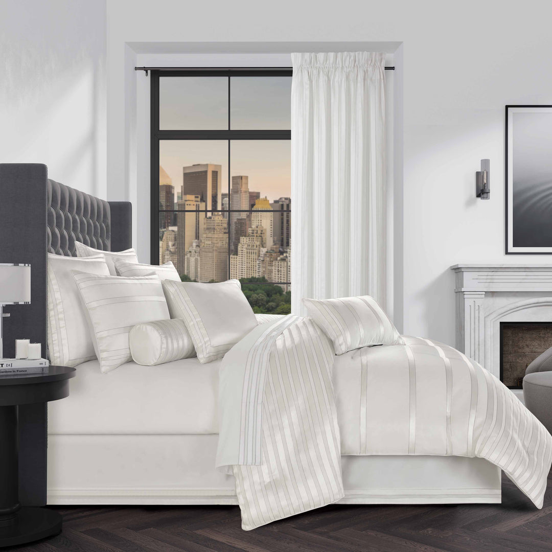 The calvari euro sham offers a modern lustrous look with its geometric polished platinum stripe border. It reverses to a geo pattern and is finished with satin piping and a hidden zipper closure for a tailored seamless finish. Pair this pillow sham with the calvari bedding set by j. Queen new york for a clean contemporary look.