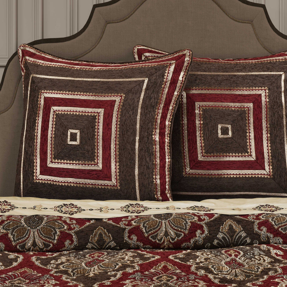The boudoir pillow is intricately designed primarily consisting of a woven chenille damask fabric, bordered by a stripe of velvet, as well as a woven chenille stripe. The boudoir reverses to a coordinating woven chenille stripe and is accented with a multi colored gimp detail, and a tassel ball fringe for added elegance. Pair this accent pillow with the cerino bedding set to complete the look.