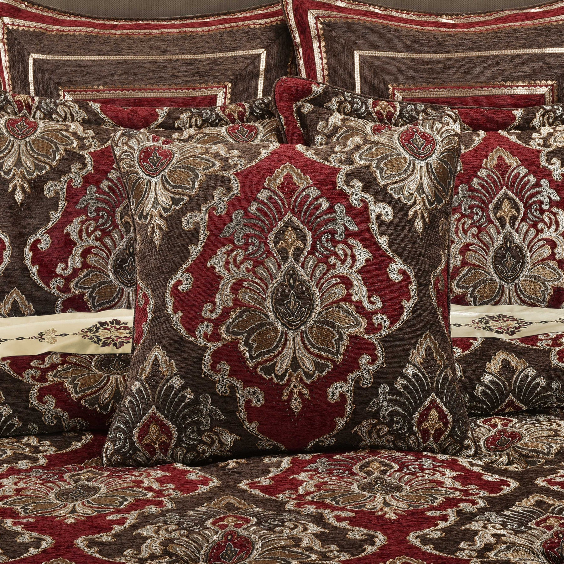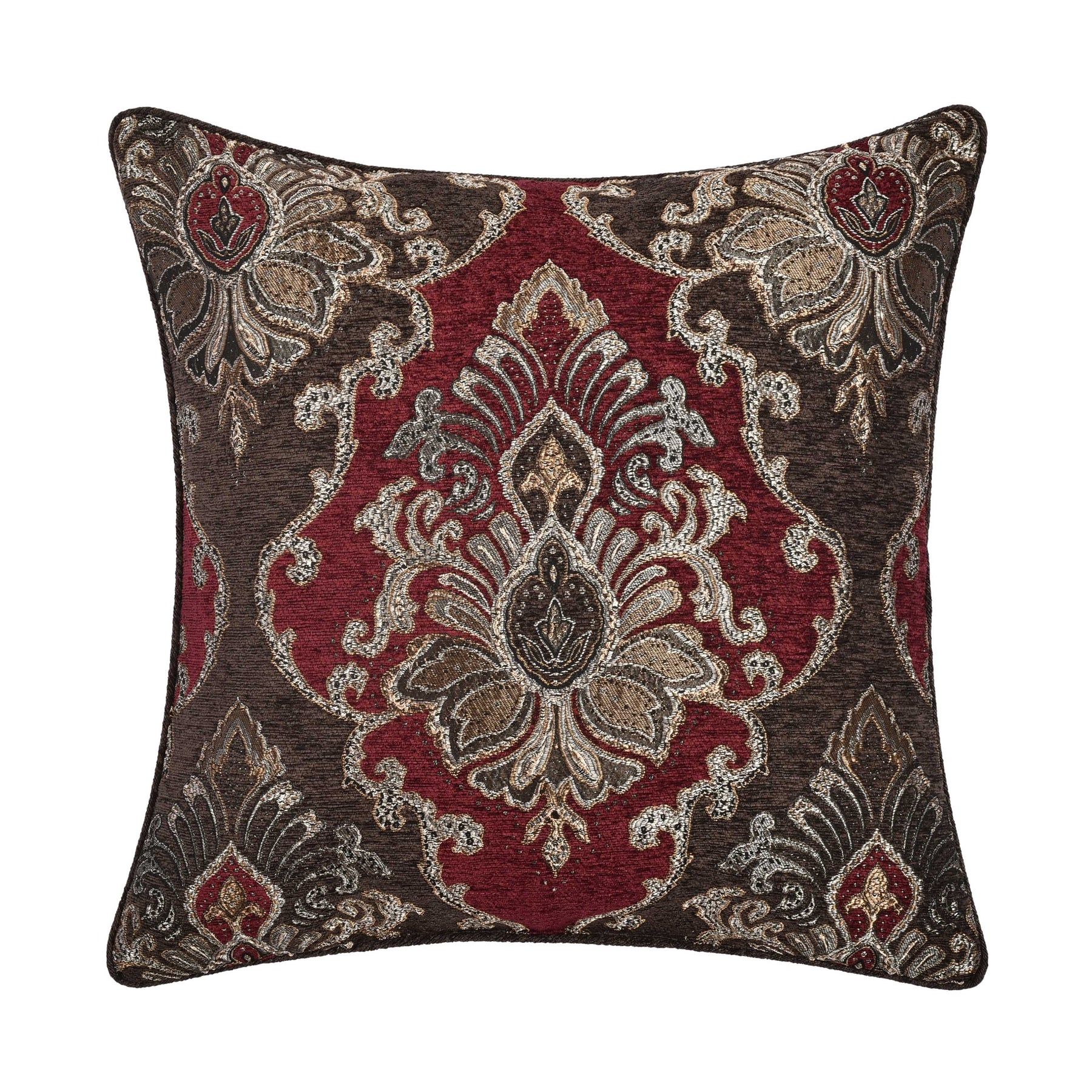 The cerino 20 inch square throw pillow features a woven chenille damask in red, gold, and chocolate tones, perfectly centered on the pillow and is finished with 1/4" solid velvet piping. It reverses to a coordinating woven chenille stripe running in the vertical direction. Pair this accent pillow with the cerino bedding set to complete the look.