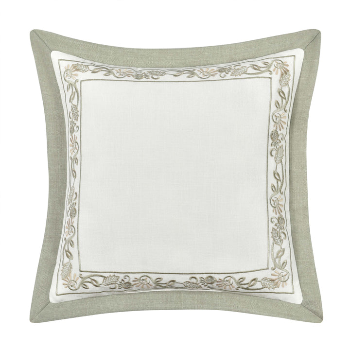 The fairview 20" square throw pillow features a delicate leaf bordered embroidery, double stitched in shades of sage green and natural tones. The simple and sophisticated elegance of this embroidered pillow sits on a white base fabric with a 2 inch flange trim. Add this to the fairview comforter set to complete the finishing touches of this beautiful collection.