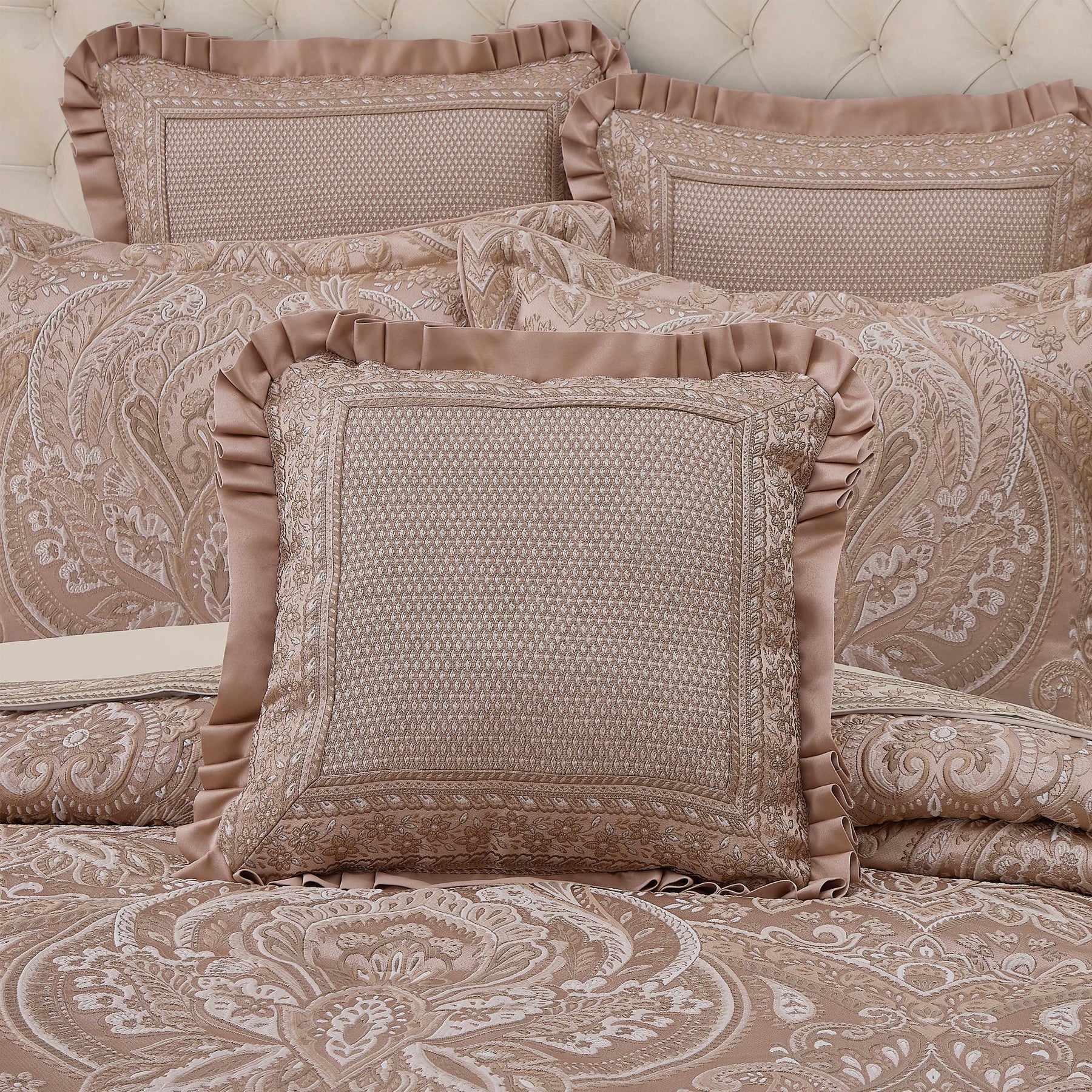 Timeless elegance inspires the fiorello 18" decorative throw pillow, which features a classic floral border, and incorporates a unique diamond weave, in stunning white and blush tones. A pleated flange finishes the lofty throw pillow and it is recommended to add as the finishing touch to the fiorello bedding set.