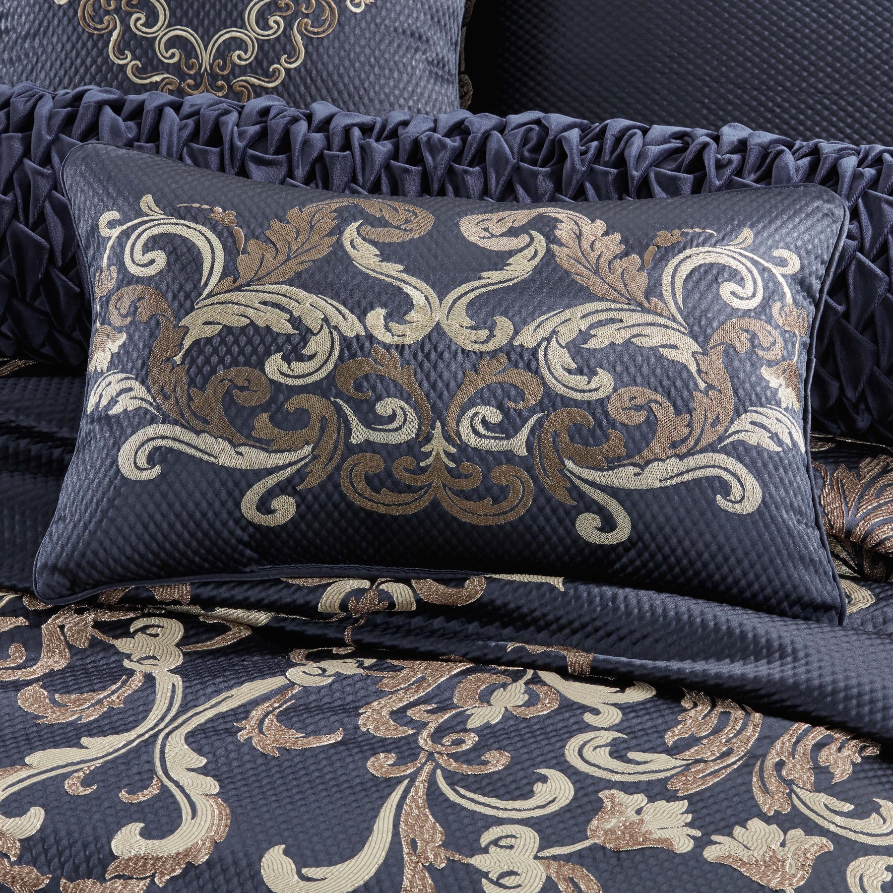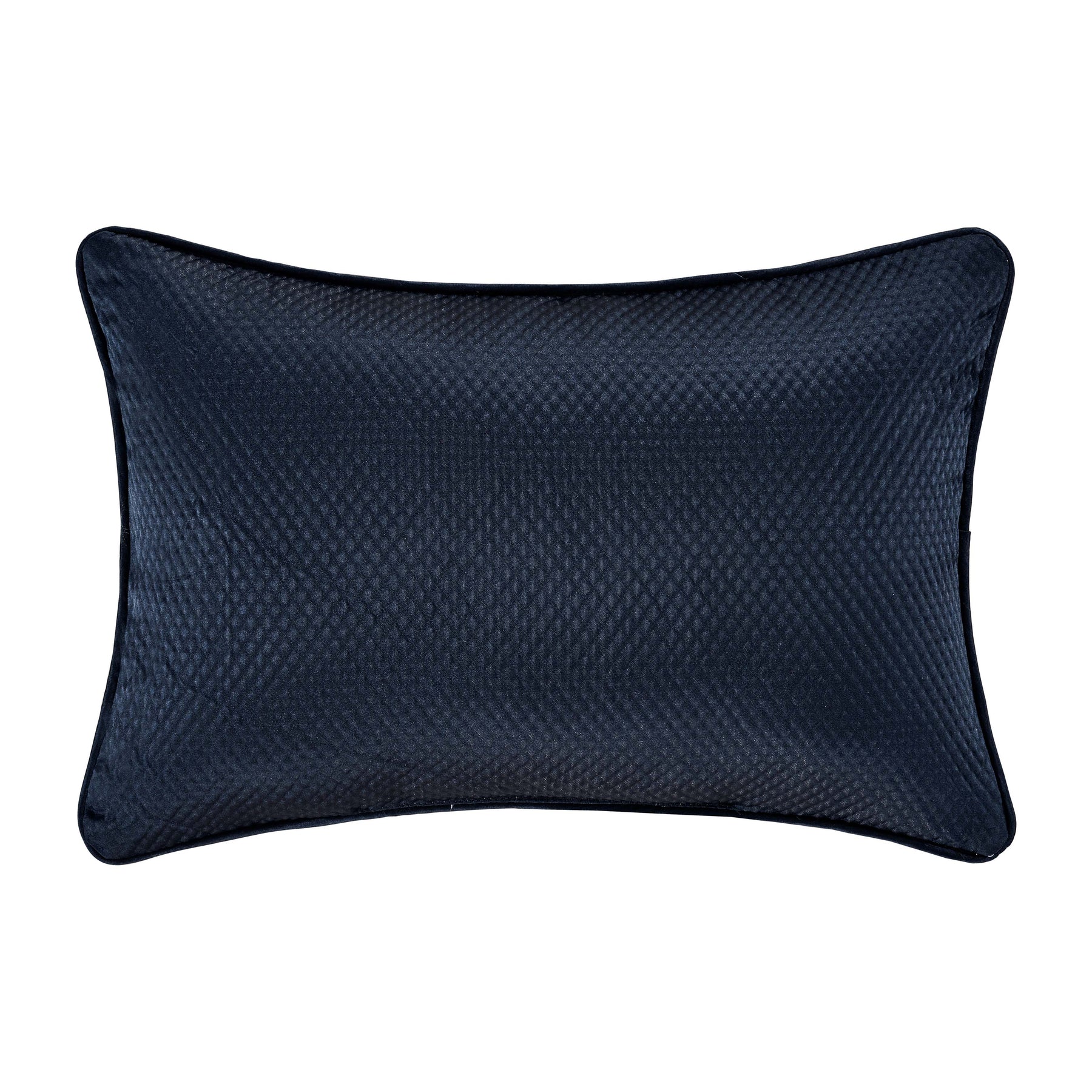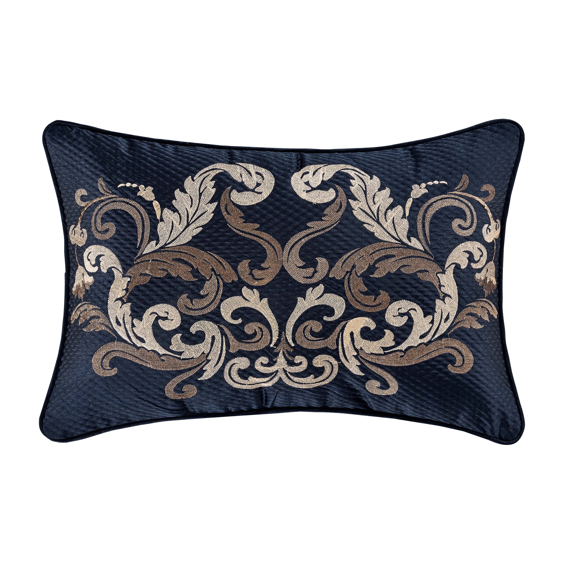 The giardino boudoir pillow is crafted with a classic royal blue silky texture fabric and intricate scroll embroidery in shades of gold. Self-fabric piping all around finishes the fine quality accent and is made to coordinate with the giardino bed set.