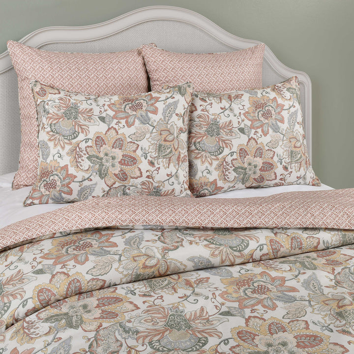 The janessa 4 piece comforter set features a beautiful jacobean design in shades of coral, gold and spice. The comforter is printed on a plush microfiber and the coordinate pillow shams are fully reversible. The bedskirt is tailored and printed with a coordinating coral tile pattern. Add the throw pillows, euro shams, and the window treatments to complete the timeless look.
