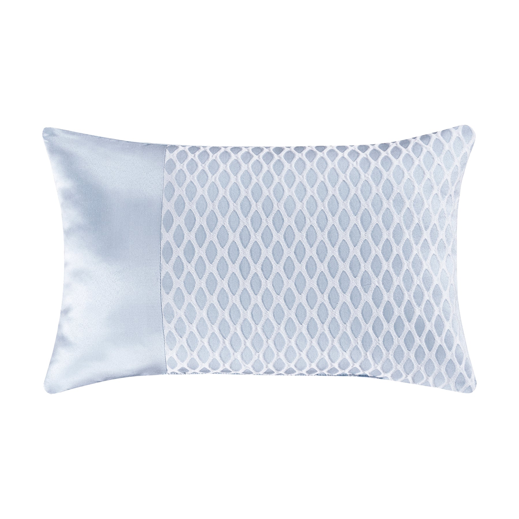 The liana boudoir throw pillow is beautifully pieced with powder blue colors, woven puff lattice design, and a complimenting tonal satin detail. This decadent pillow adds a touch of contemporary style to the overall traditional look of the bedding set. Pair this accent pillow with the liana bedding set by J. Queen new york for a complete look.