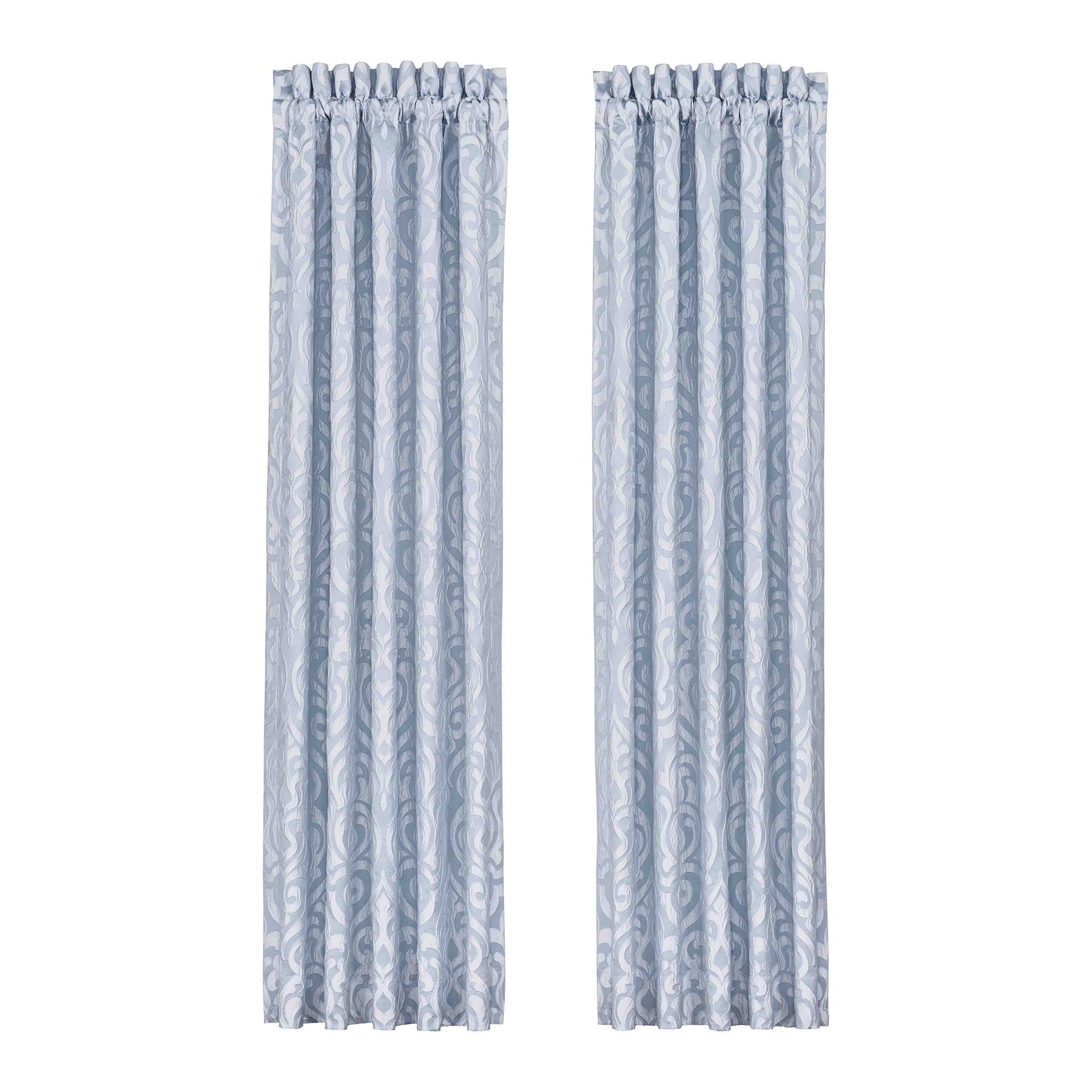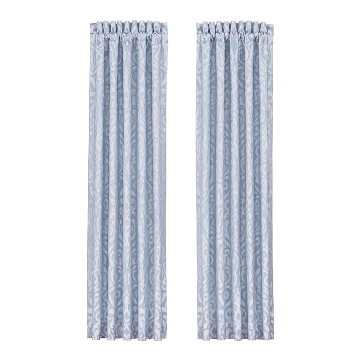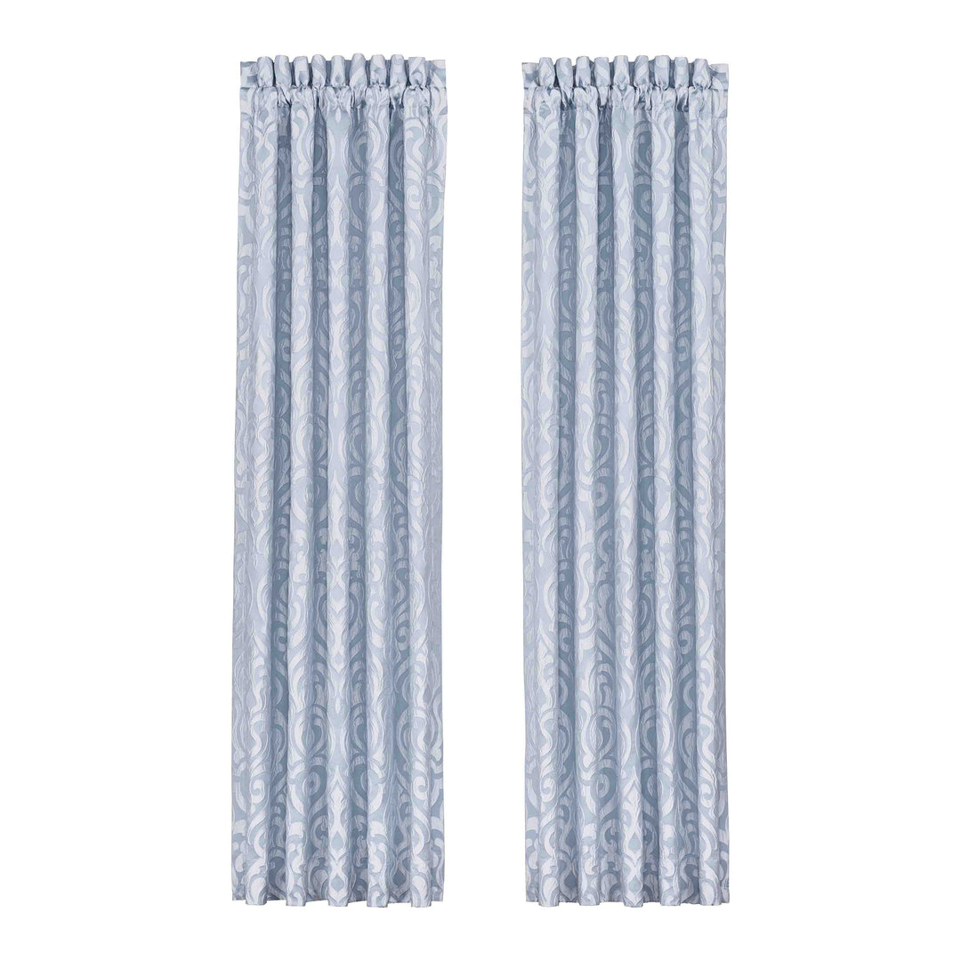 The liana window panel pair is exquisite with its fine details and sophisticated use of powder blue colors. This beautiful woven puff damask fabric is rich with its 3-dimensional weave and soft satin finish. These lined panels include tiebacks to create an open airy look and provide light filtering shade keeping your room comfortable throughout the day. The 3" header and 3" rod pocket make these panels easy to hang and are the perfect finishing touch to complete a traditional luxury look to your decor. Pair these panels with the liana window valance and bedding set by J. Queen new york for a complete look.