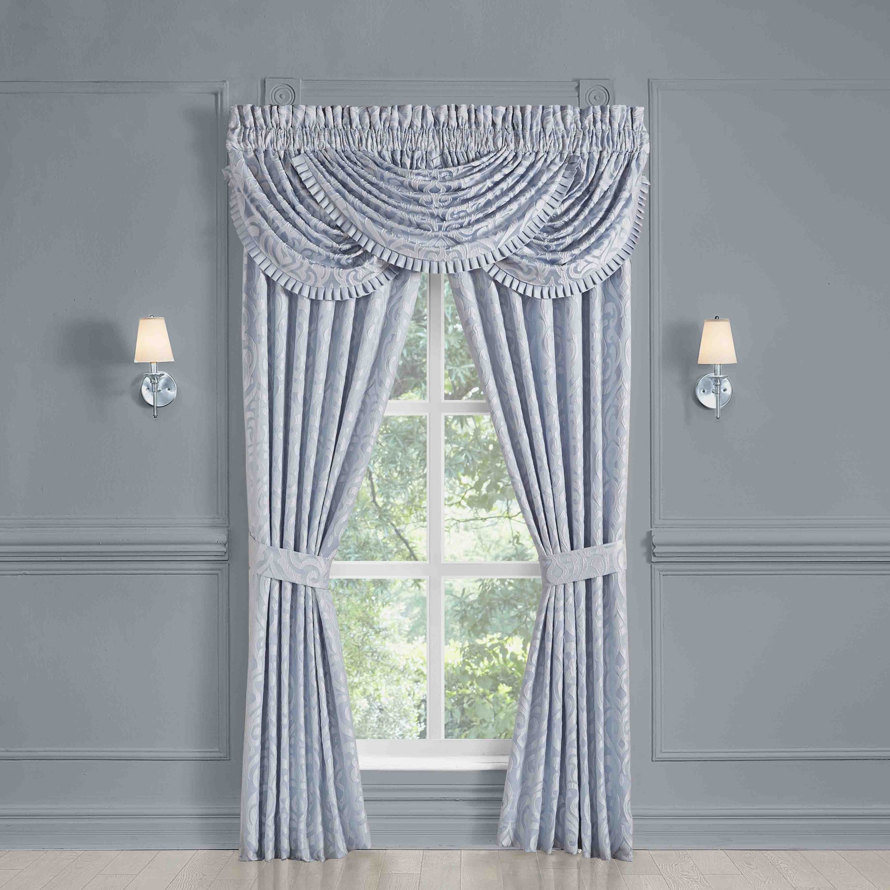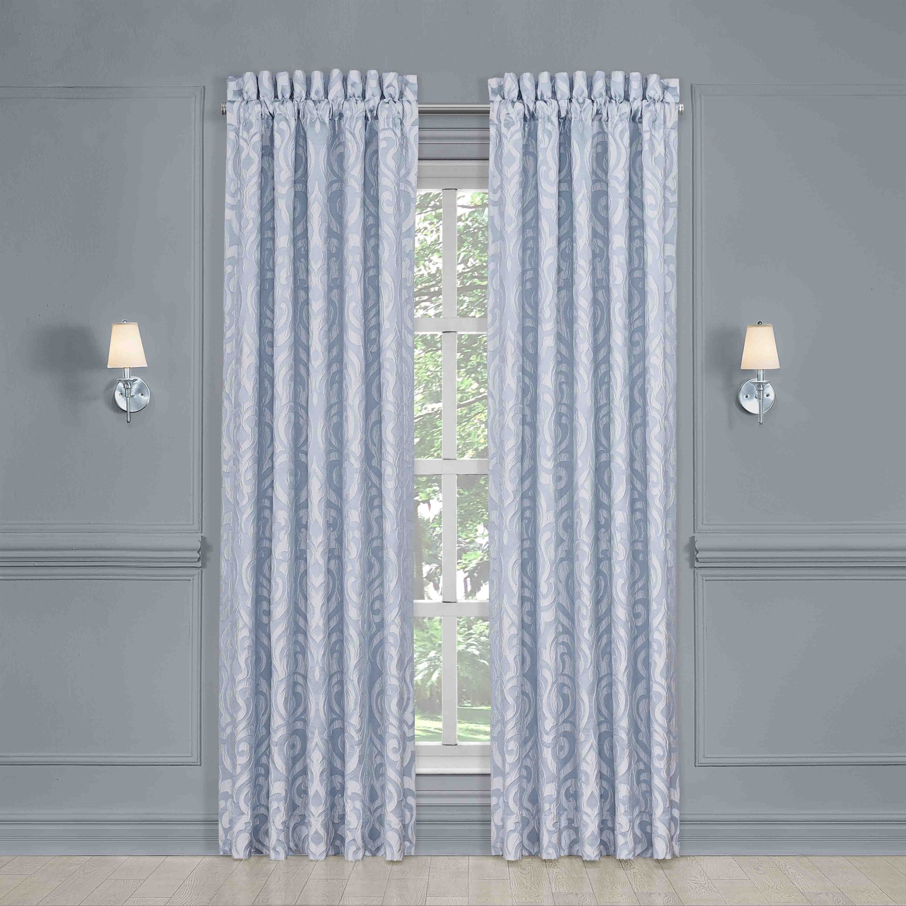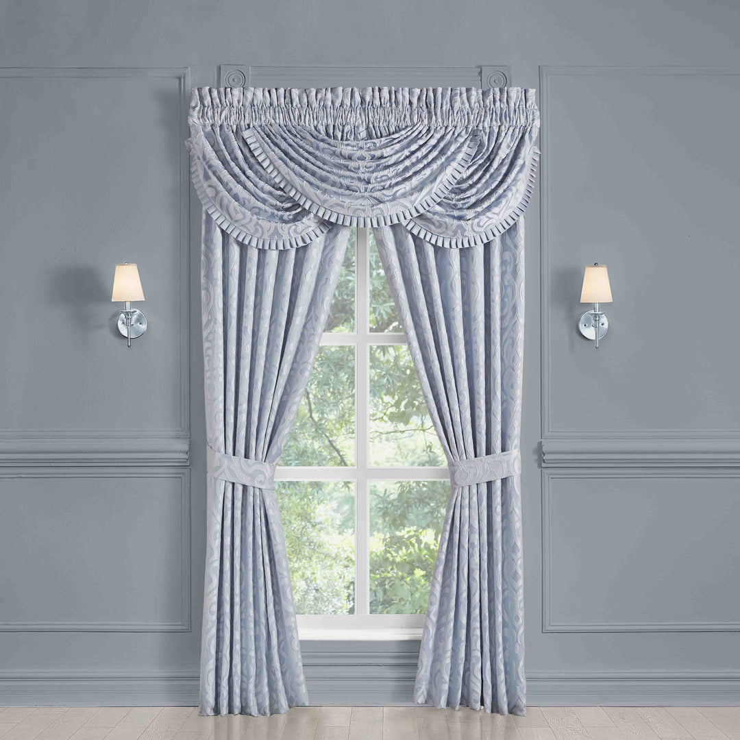 The liana window panel pair is exquisite with its fine details and sophisticated use of powder blue colors. This beautiful woven puff damask fabric is rich with its 3-dimensional weave and soft satin finish. These lined panels include tiebacks to create an open airy look and provide light filtering shade keeping your room comfortable throughout the day. The 3" header and 3" rod pocket make these panels easy to hang and are the perfect finishing touch to complete a traditional luxury look to your decor. Pair these panels with the liana window valance and bedding set by J. Queen new york for a complete look.
