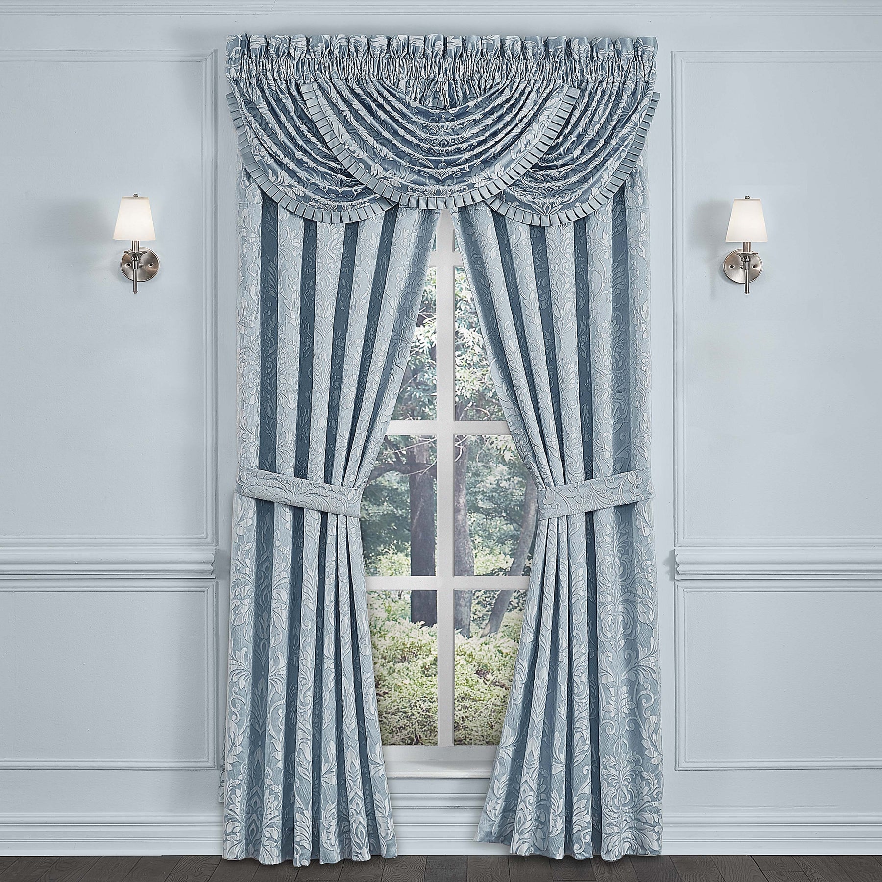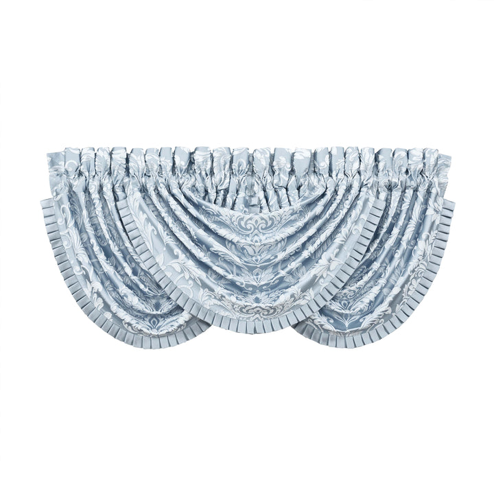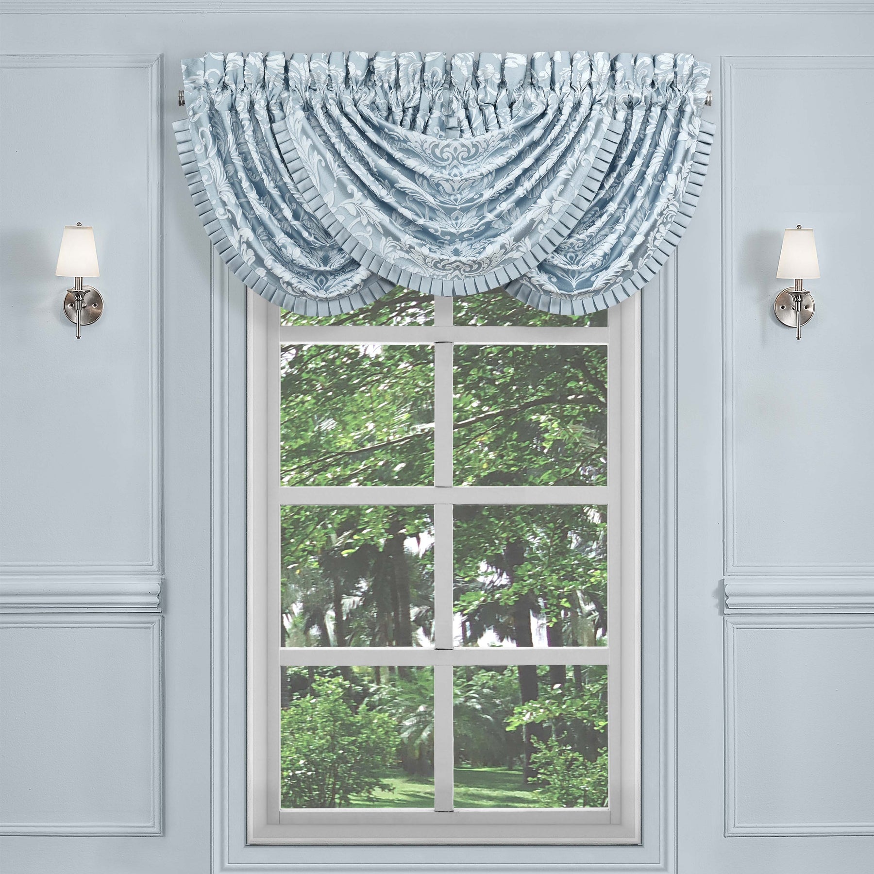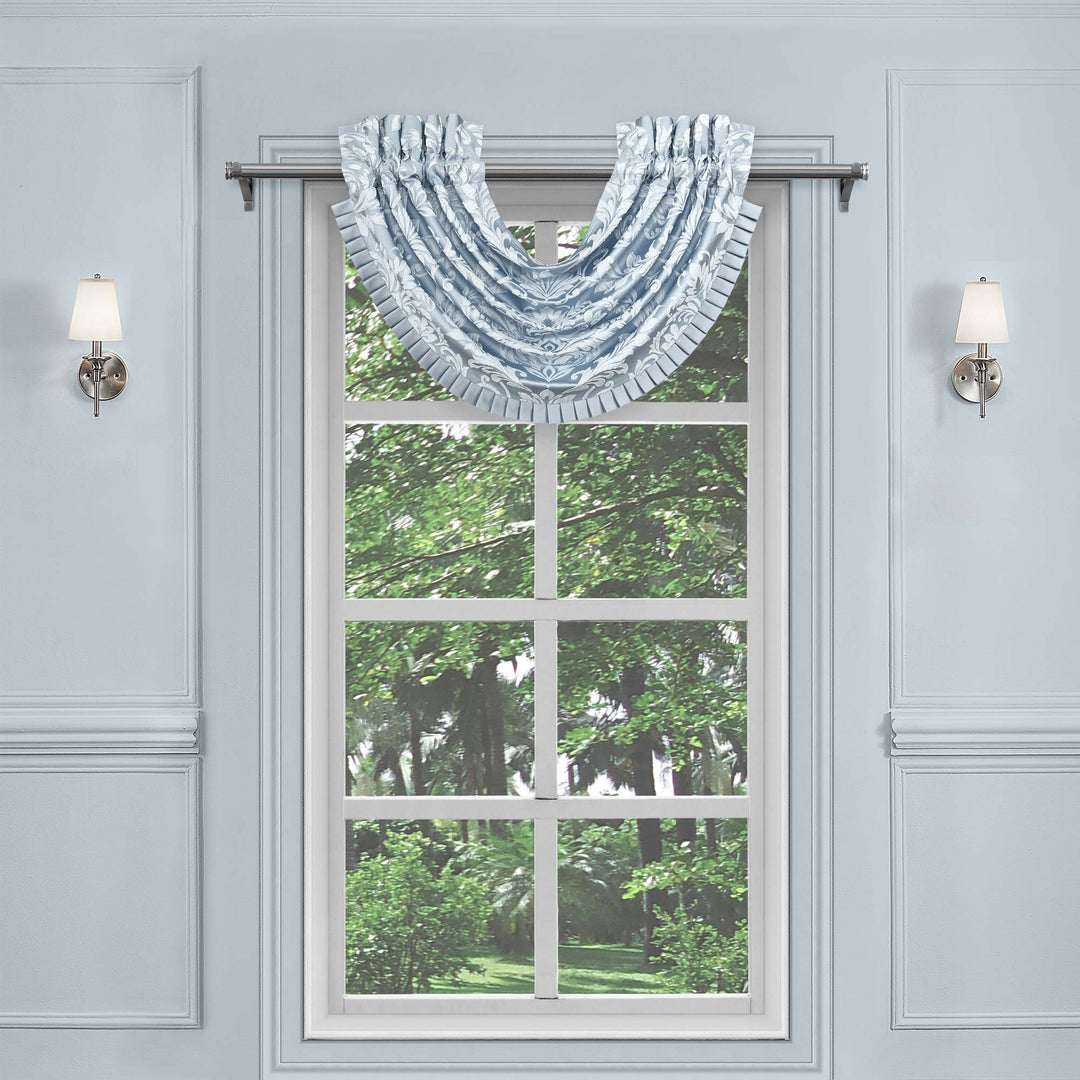 Designed for the ultimate look of luxury, the malita waterfall valance uses a grand woven jacquard damask fabric that is trimmed with a pleated satin flange. The powder blue tones are soft yet elegant and they are lined for insulation and constructed with a 3 inch header with a 3‚¬� rod pocket for easy setup.