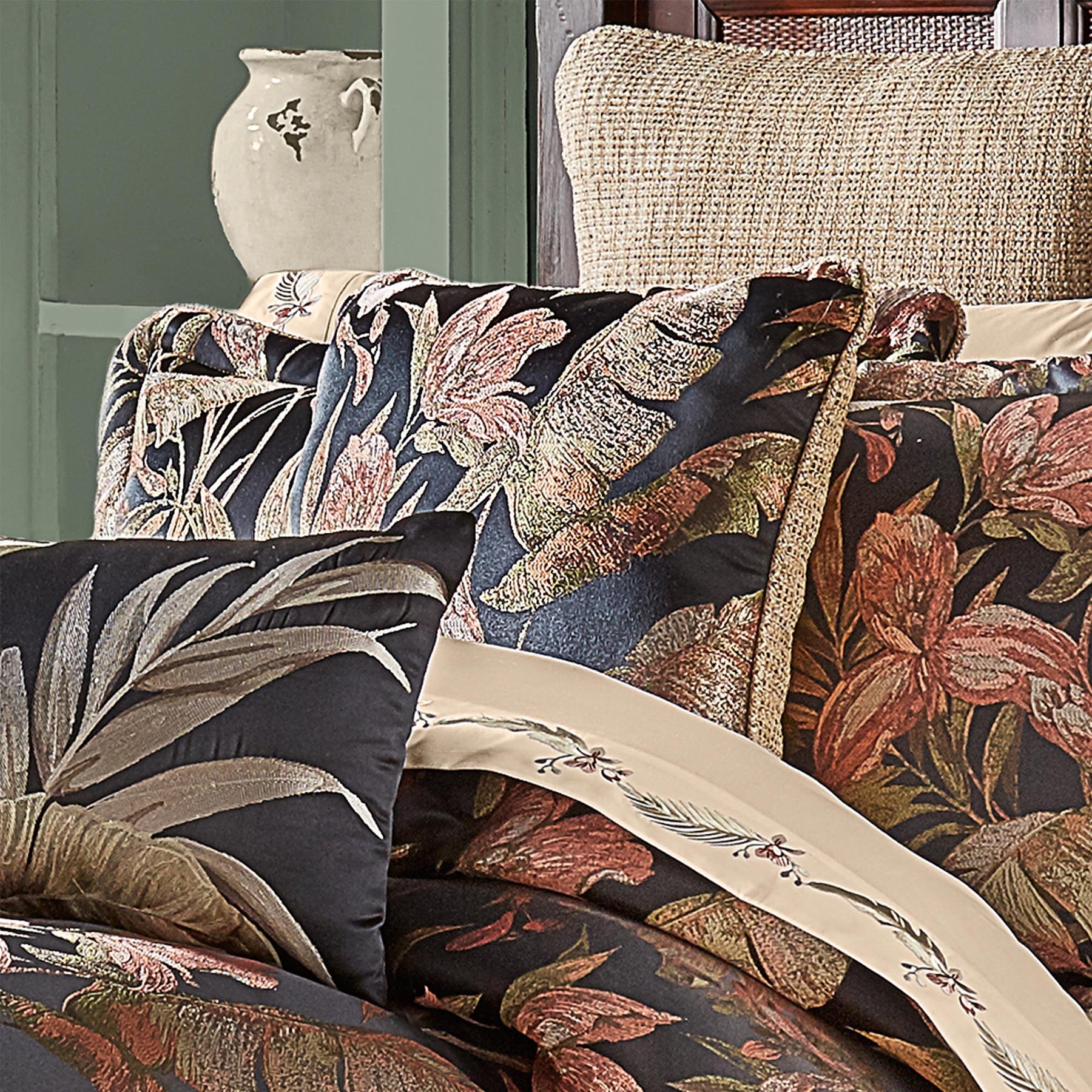 The martinique 20 inch decorative throw pillow is exquisite with its bold use of black and coral tones. This beautiful square pillow is truly unique with a lovely printed tropical pattern featuring palm leaves and flowers and finished with a 1/4" textured gold piping for added detail. Pair this pillow with the martinique bedding set by J. Queen new york for a complete look.
