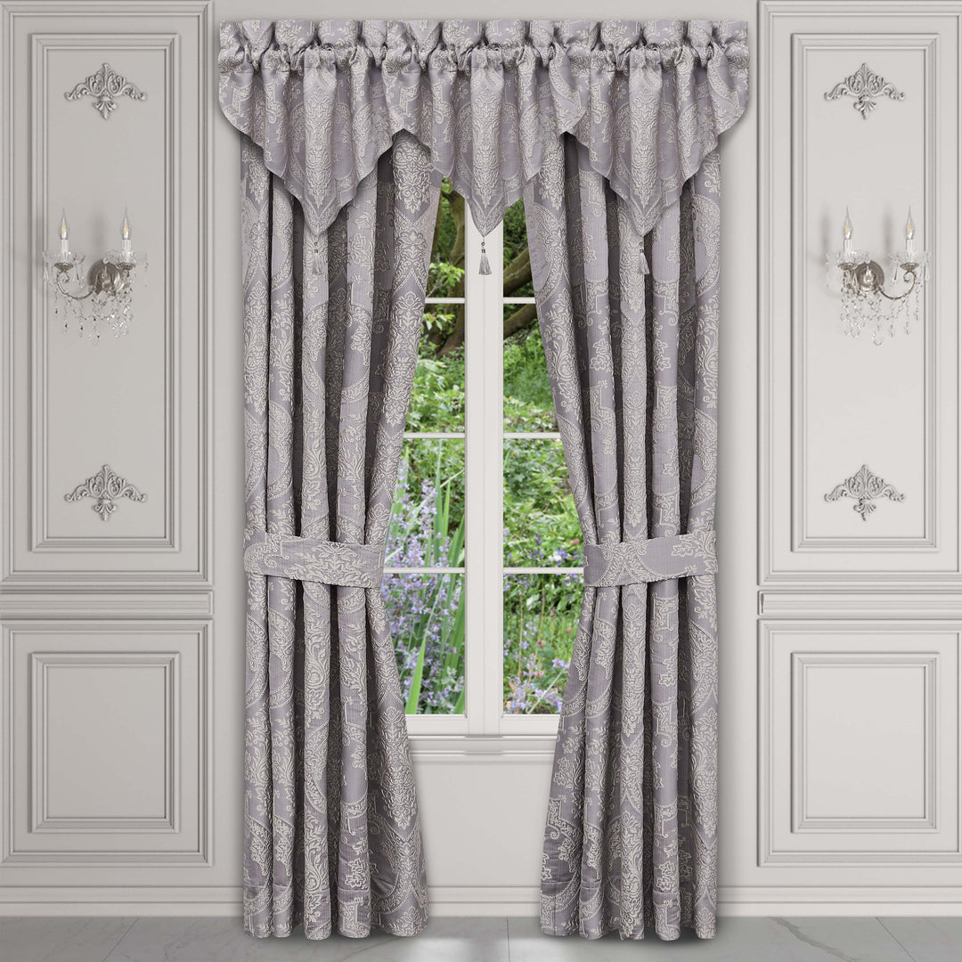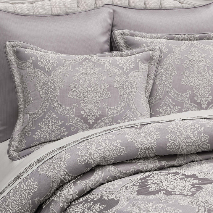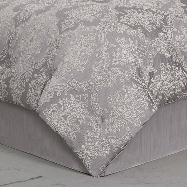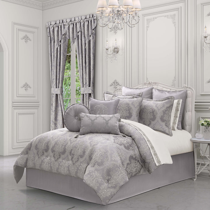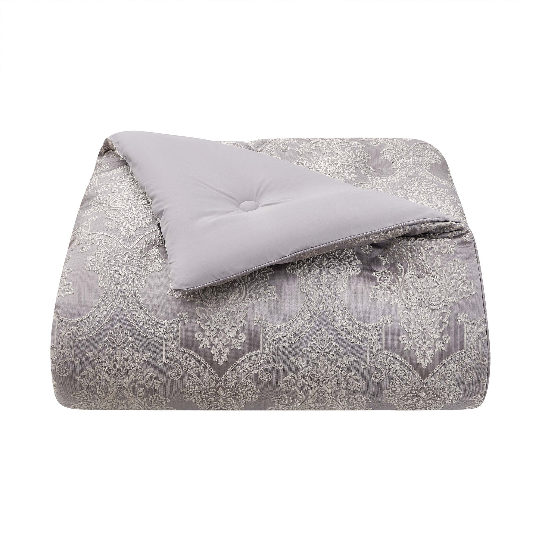 The mary 4 piece comforter set will add elegance, glamour and timeless luxury to your bedroom decor. Constructed with a highly detailed woven damask in gorgeous tones of lavender and soft silver hues, creating endless dimension. This stunning oversized and overfilled comforter is truly one that will give you lasting comfort and an array of complements. Paired with matching shams and a split-corner tailored woven stria bedskirt that pulls the beauty all together. Pair this bedding collection with the mary throw pillows, shams, and window treatments for a complete look.