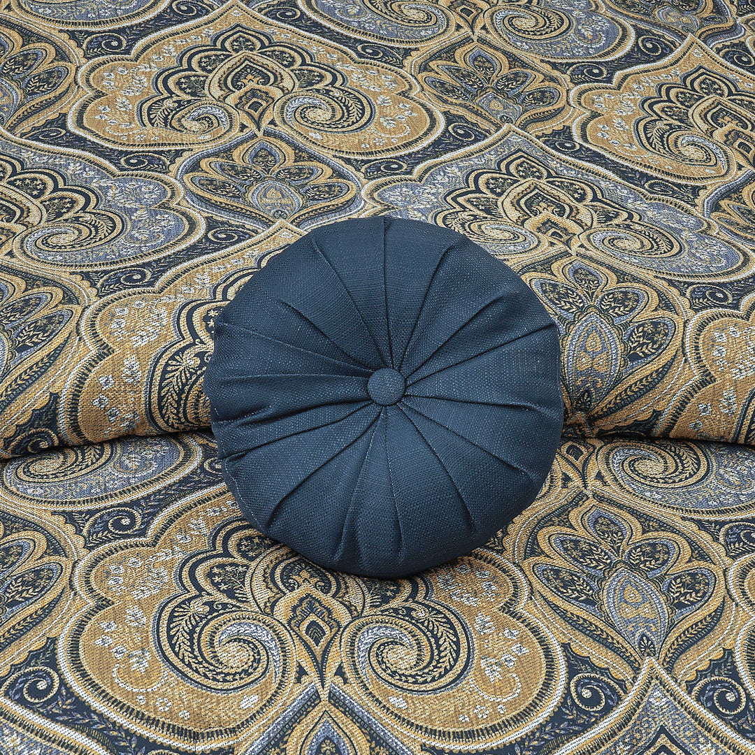 The messina hand-crafted tufted round pillow uses an elegant navy blue fabric to create a luxurious accent to the ensemble. Completely pleated all the way around with a large button accent which gives the pillow a truly unique appeal.