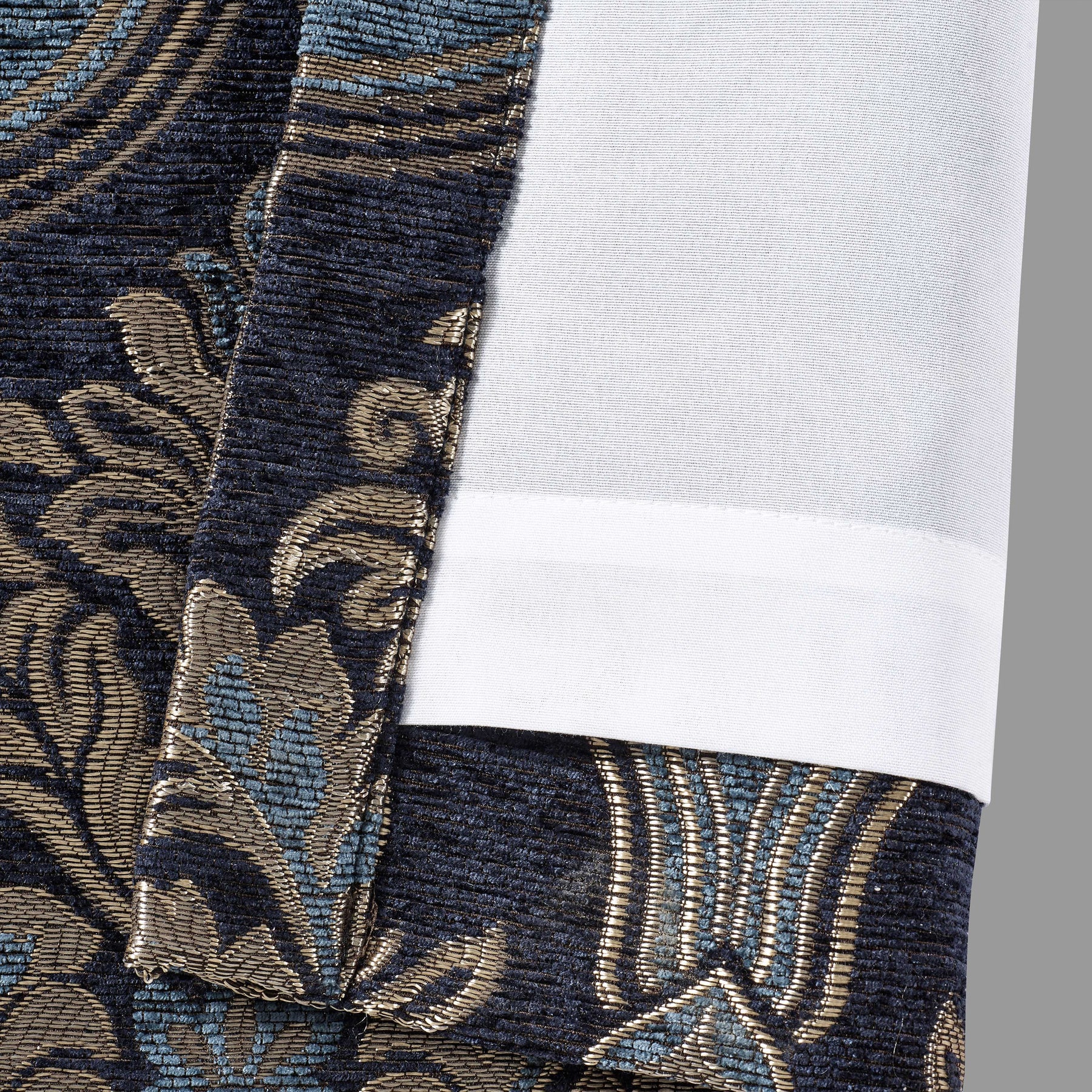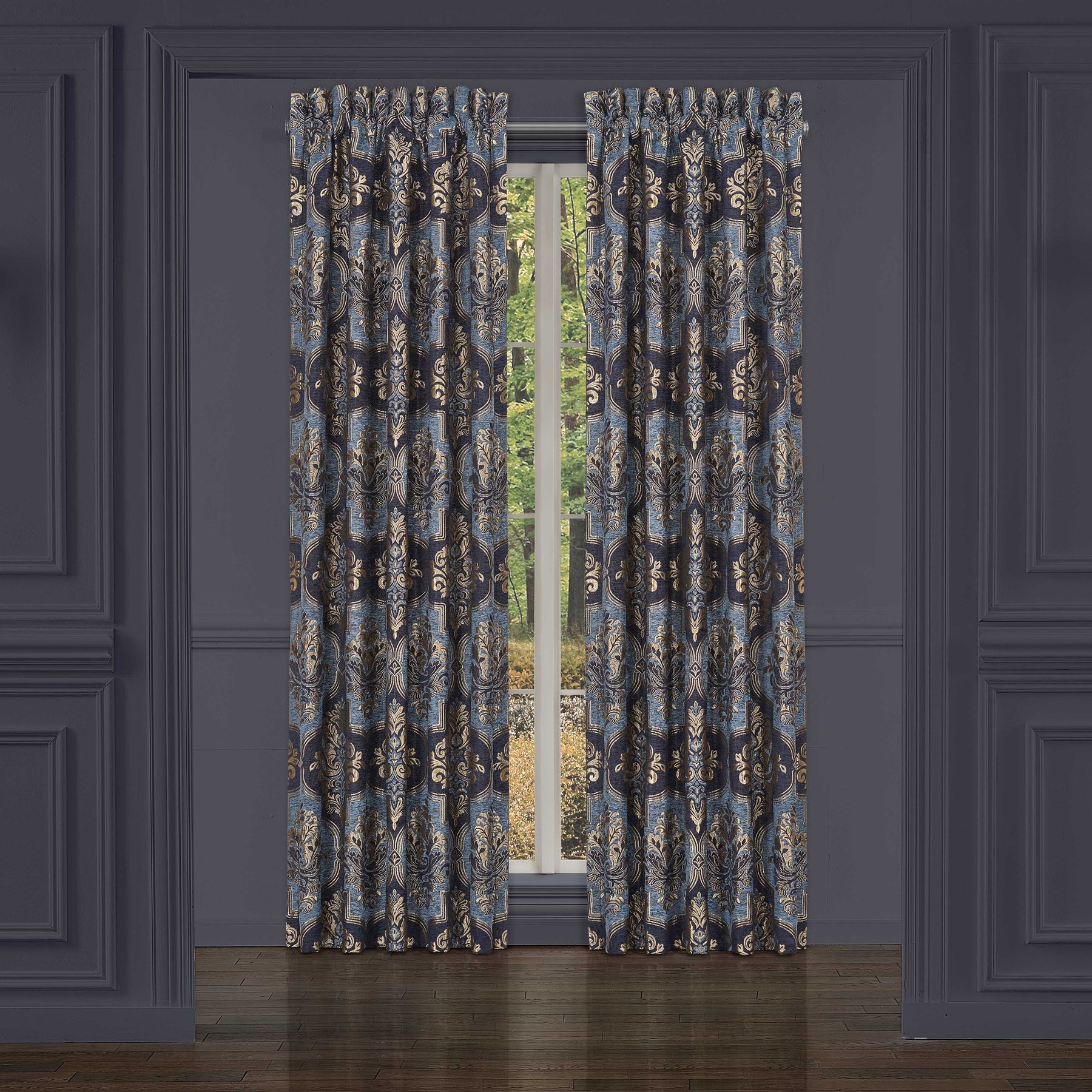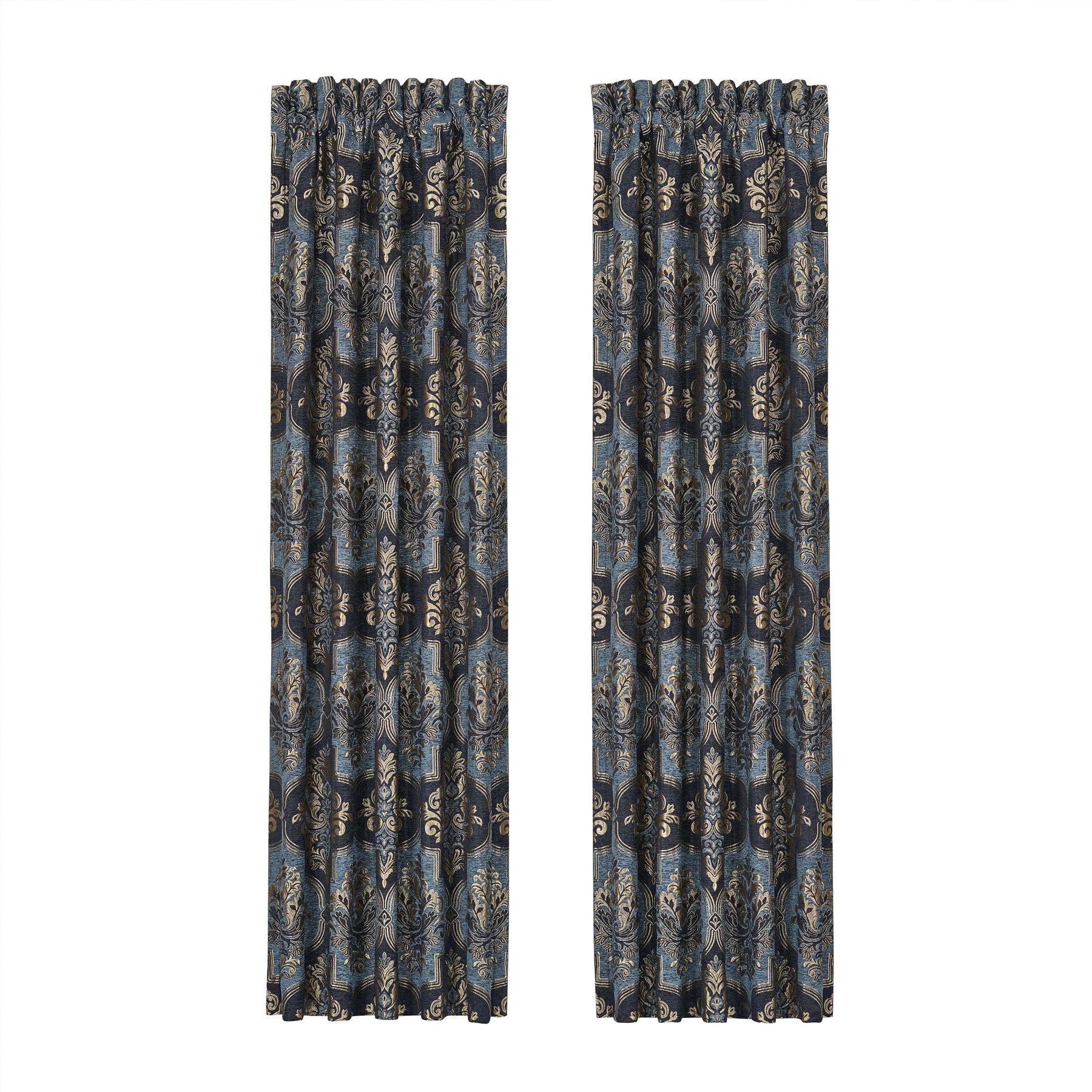 The middlebury window panel pair features a framed woven damask in two tones of chenille indigo and blue. These lined panels provide room darkening shade to keep your room cool and comfortable. The 3" header and 3" rod pocket make these panels easy to hang. Pair these panels with the middlebury window valance and bedding set for a complete elegant look.