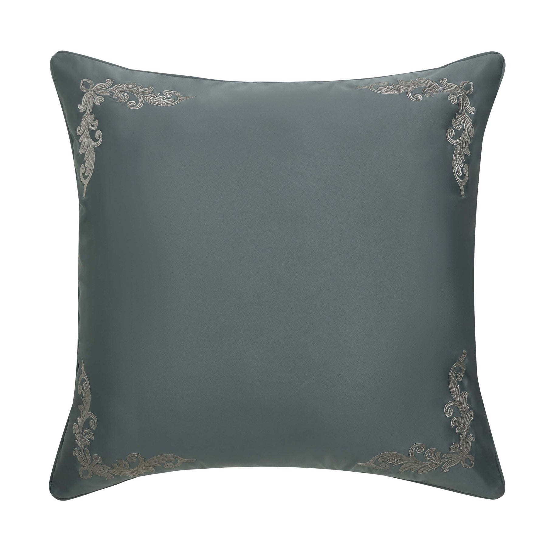The renata euro sham features a woven scroll border design to create a detailed frame. Trimmed with a self-fabric cord on all corners with a teal and silver satin fabric. This elegant euro sham is made to coordinate with the renata bed set for a complete look.